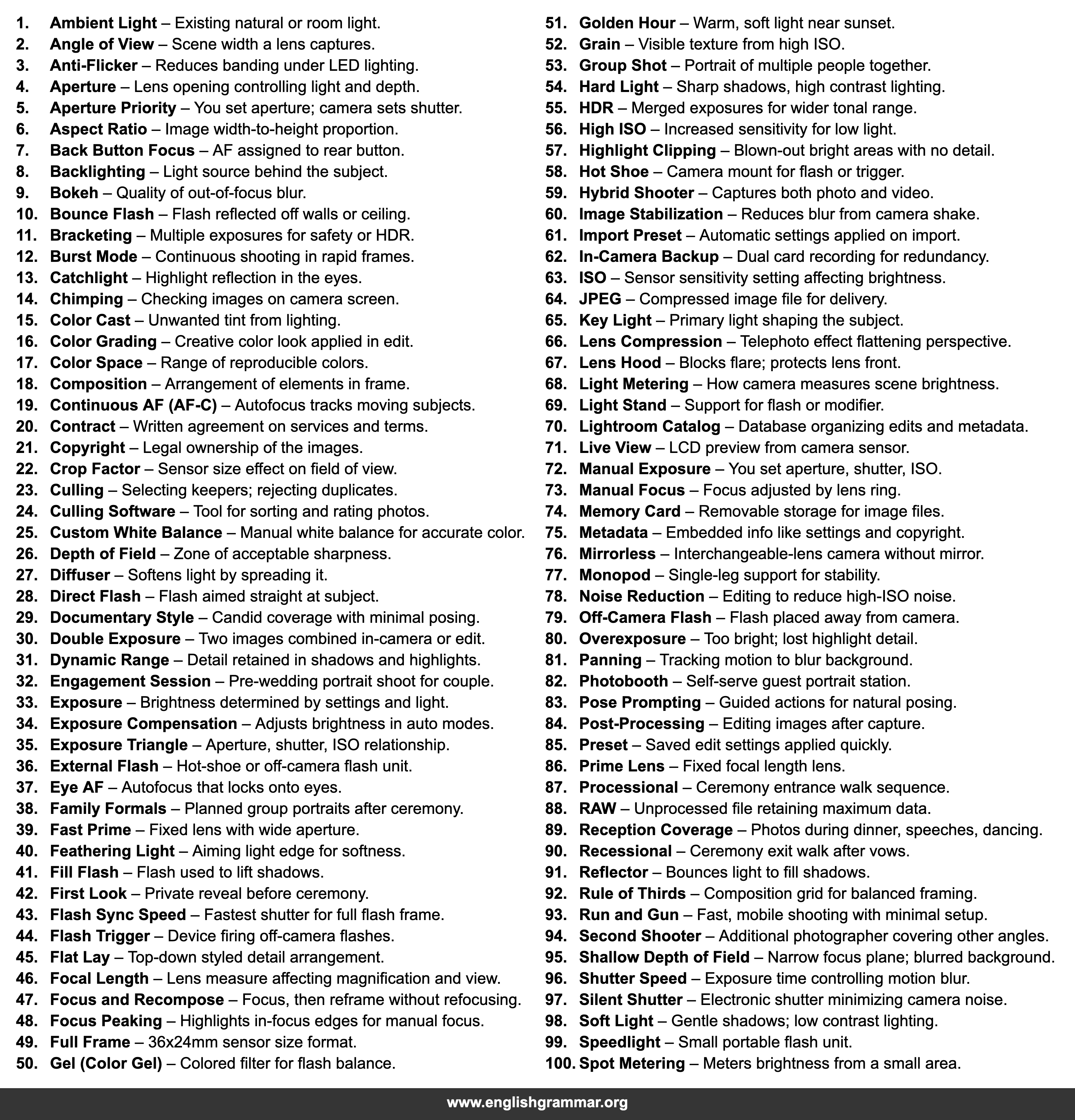 | 10. | Bounce Flash | Flash reflected off walls or ceiling. |
