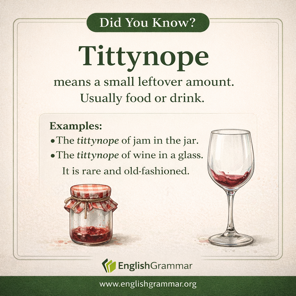 Tittynope is a rare, old fashioned English word for a very small leftover amount, especially of food or drink. It usually refers to the little bit that remains after most of something has been used or consumed.