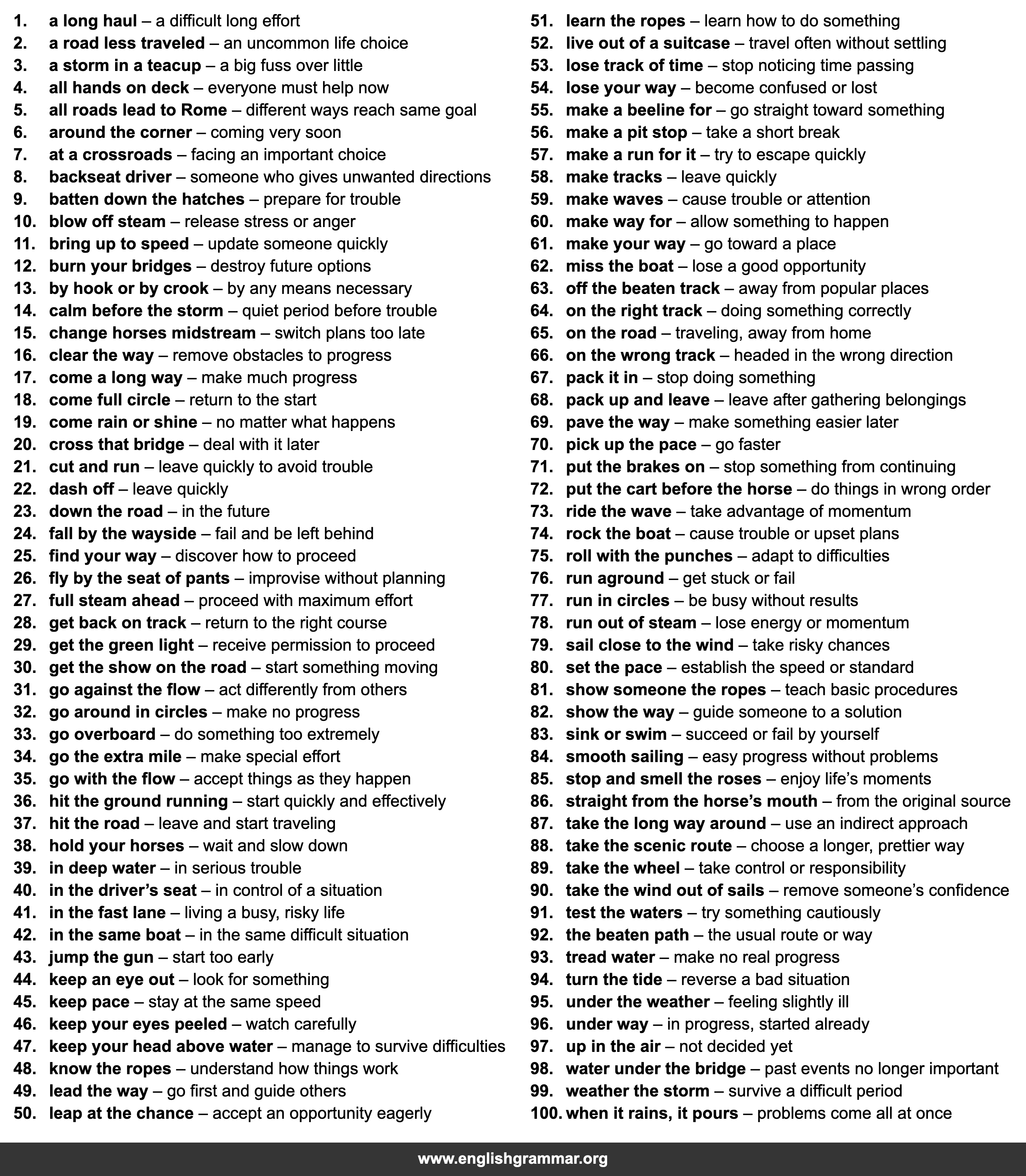 | 100. | when it rains, it pours | problems come all at once |