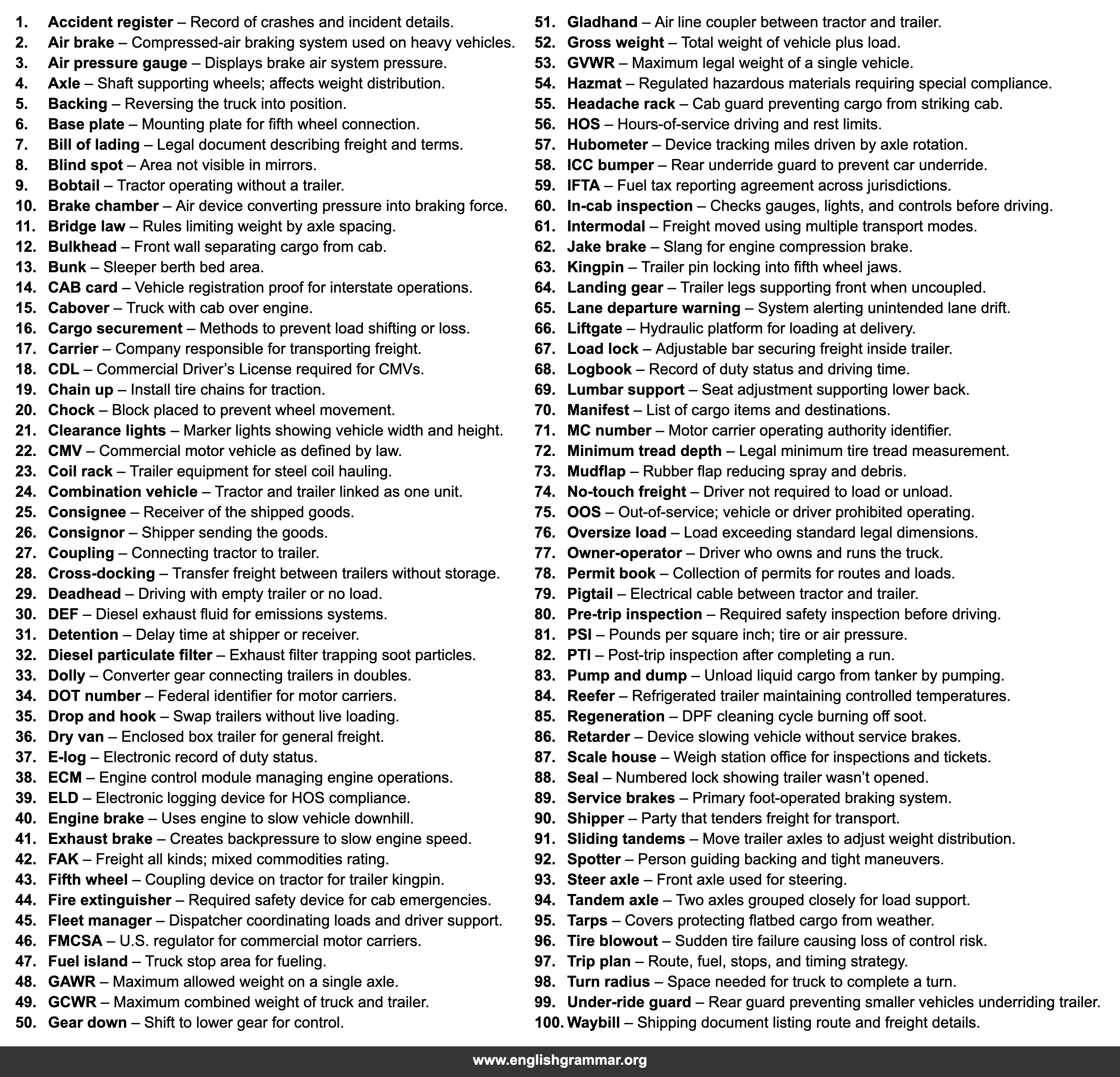 | 98. | Turn radius | Space needed for truck to complete a turn. |