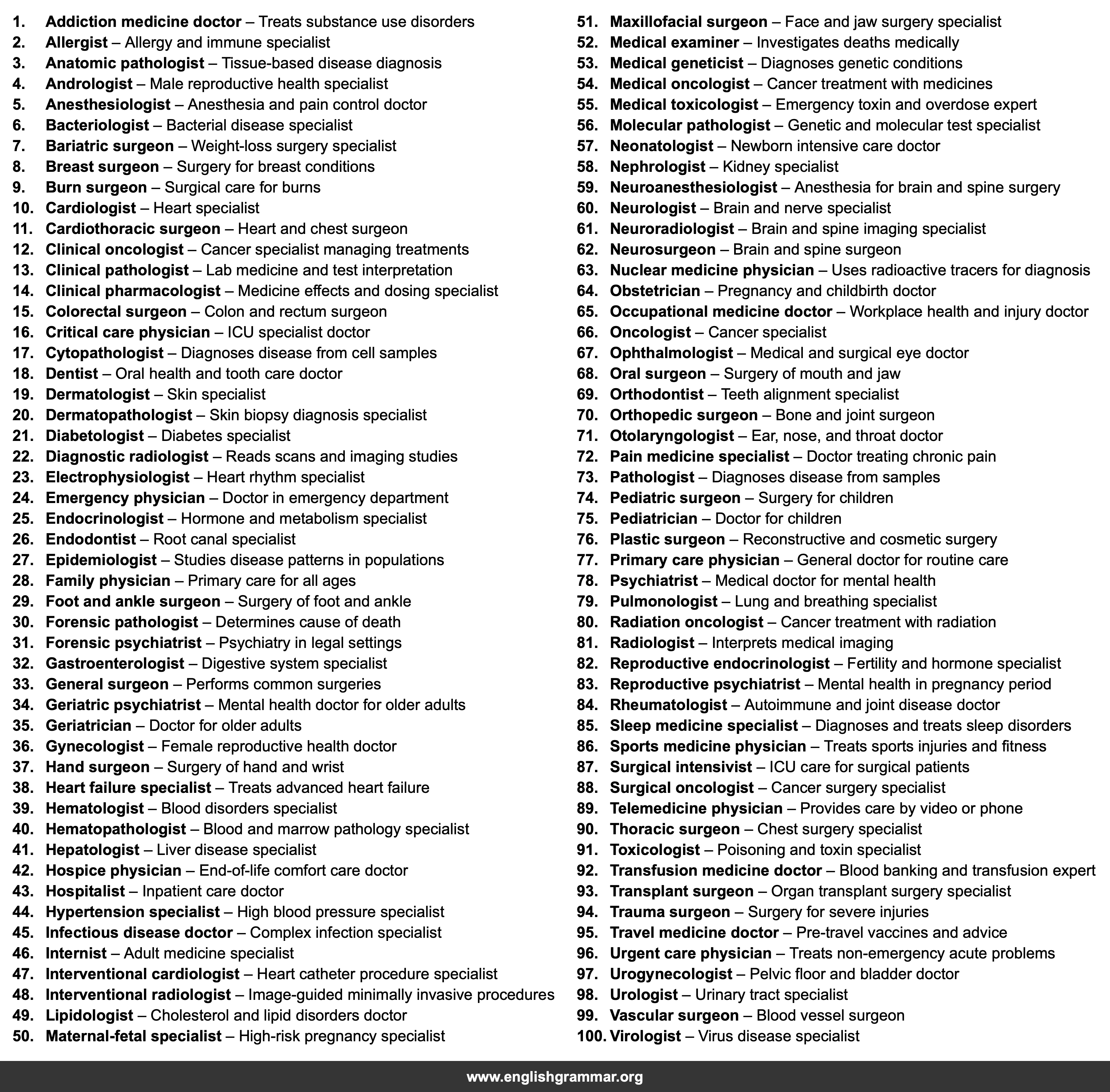 | 49. | Lipidologist | Cholesterol and lipid disorders doctor |