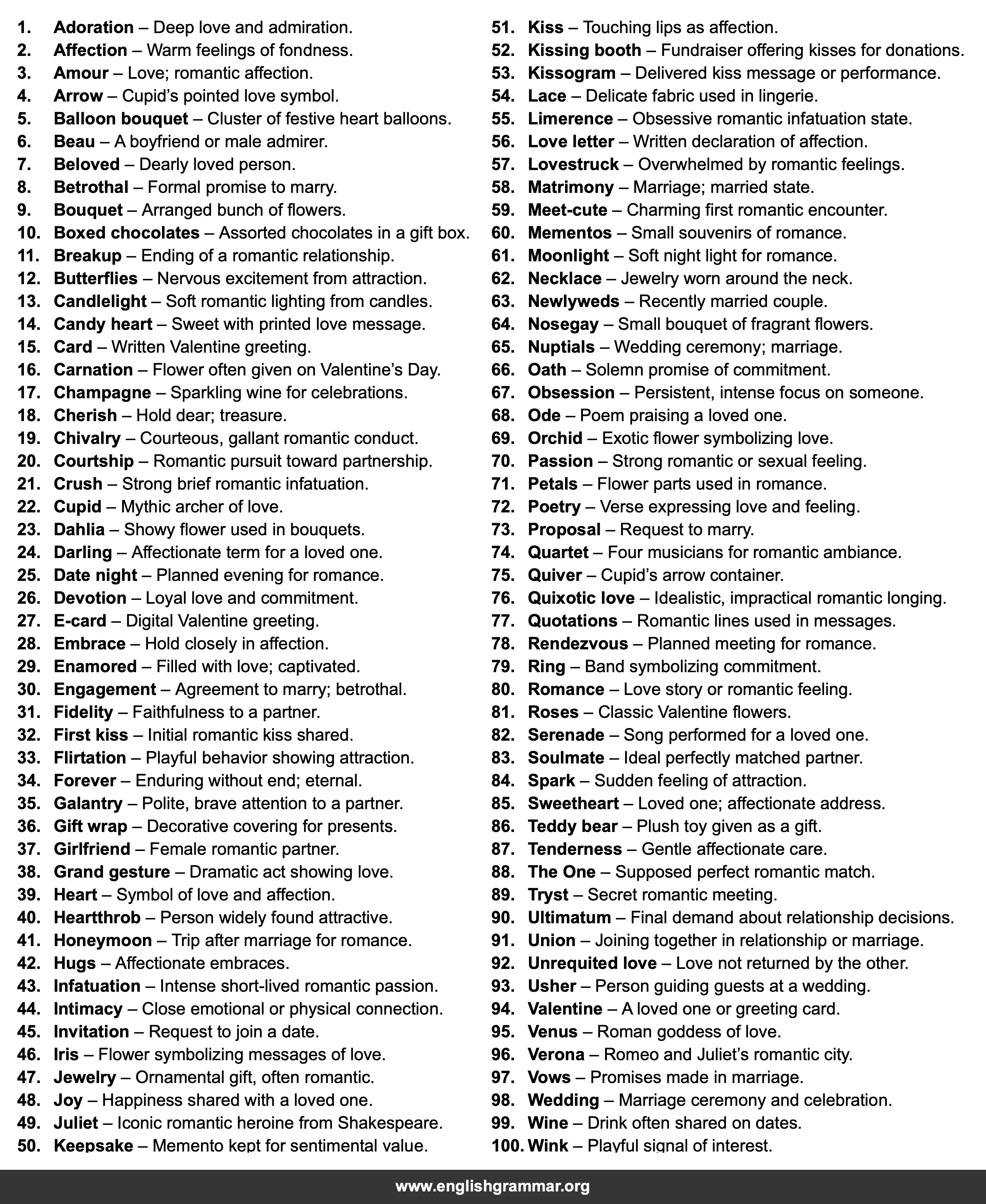 | 57. | Lovestruck | Overwhelmed by romantic feelings. |