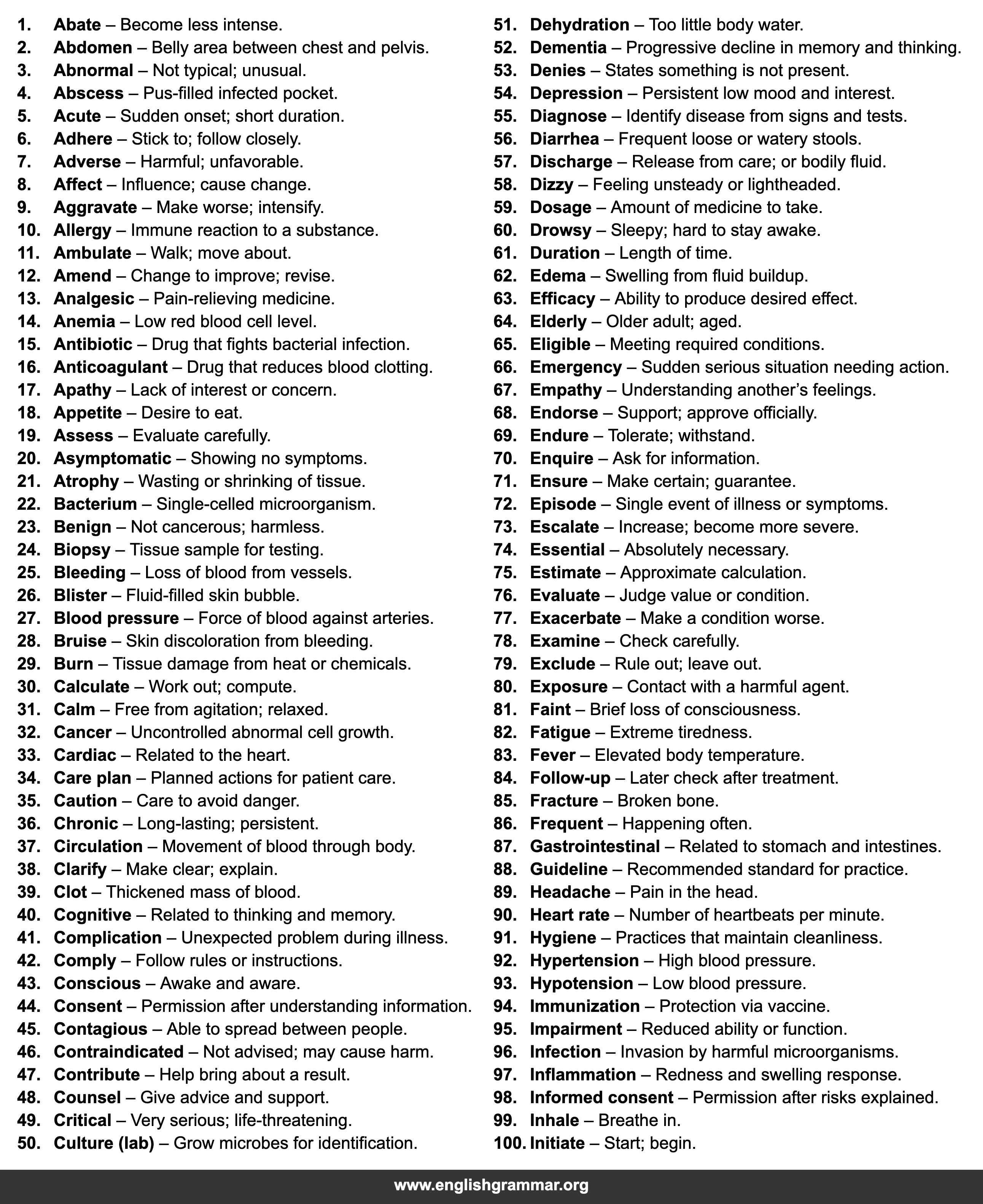 | 11. | Ambulate | Walk; move about. |
