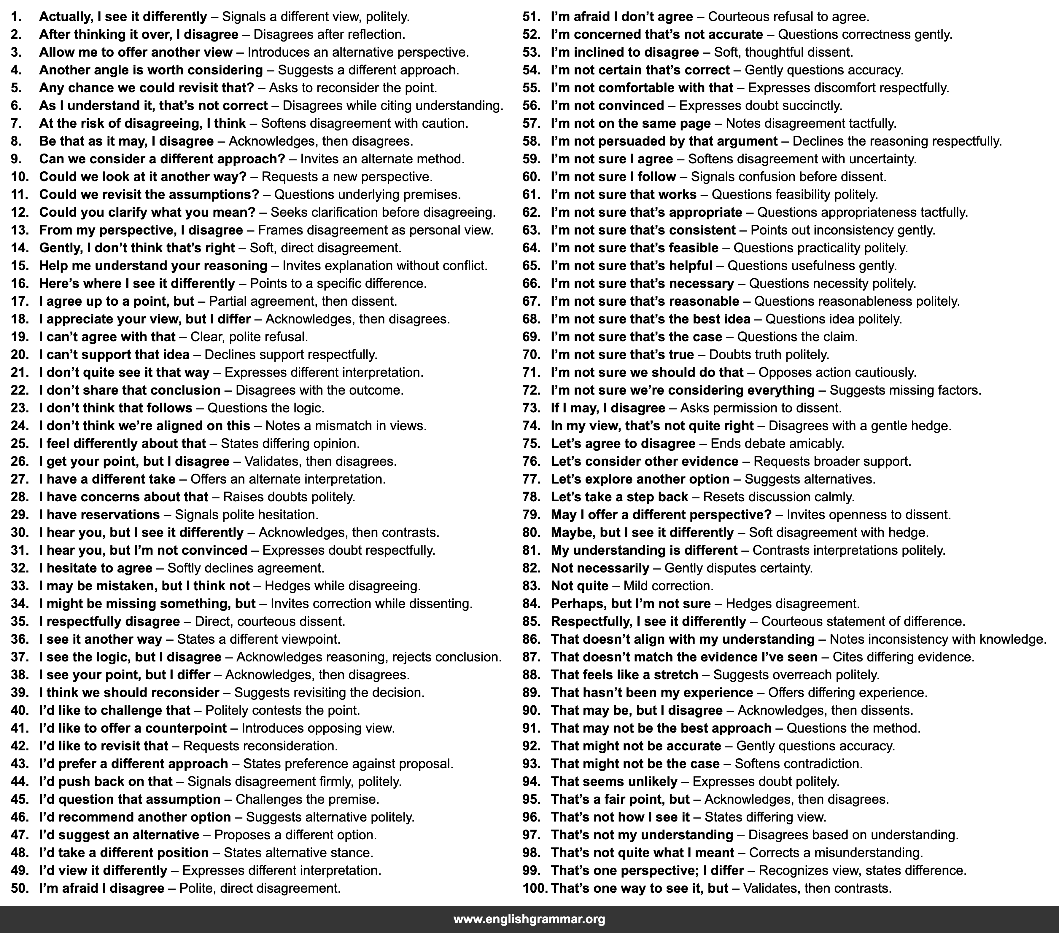 | 35. | I respectfully disagree | Direct, courteous dissent. |