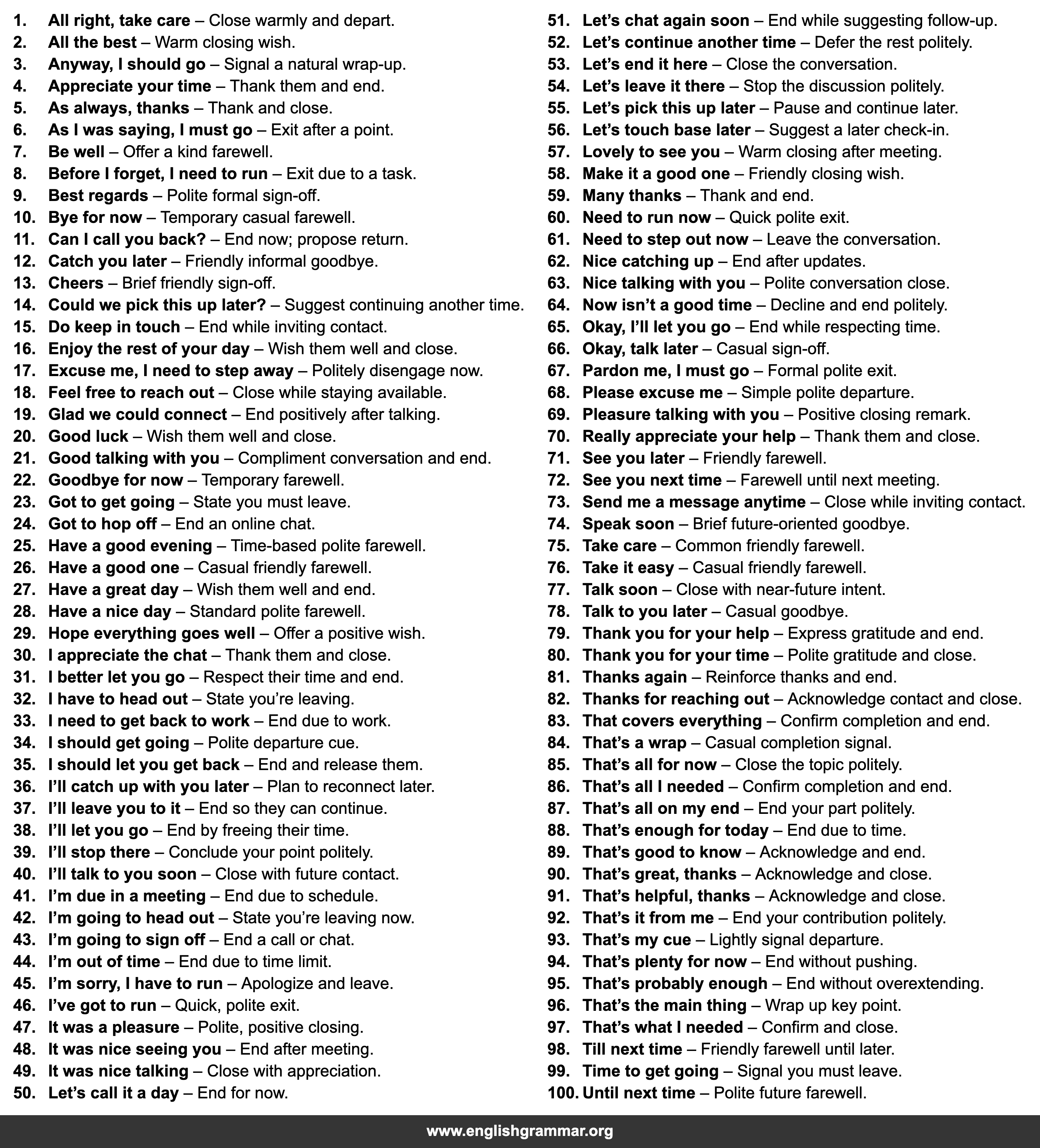 | 98. | Till next time | Friendly farewell until later. |