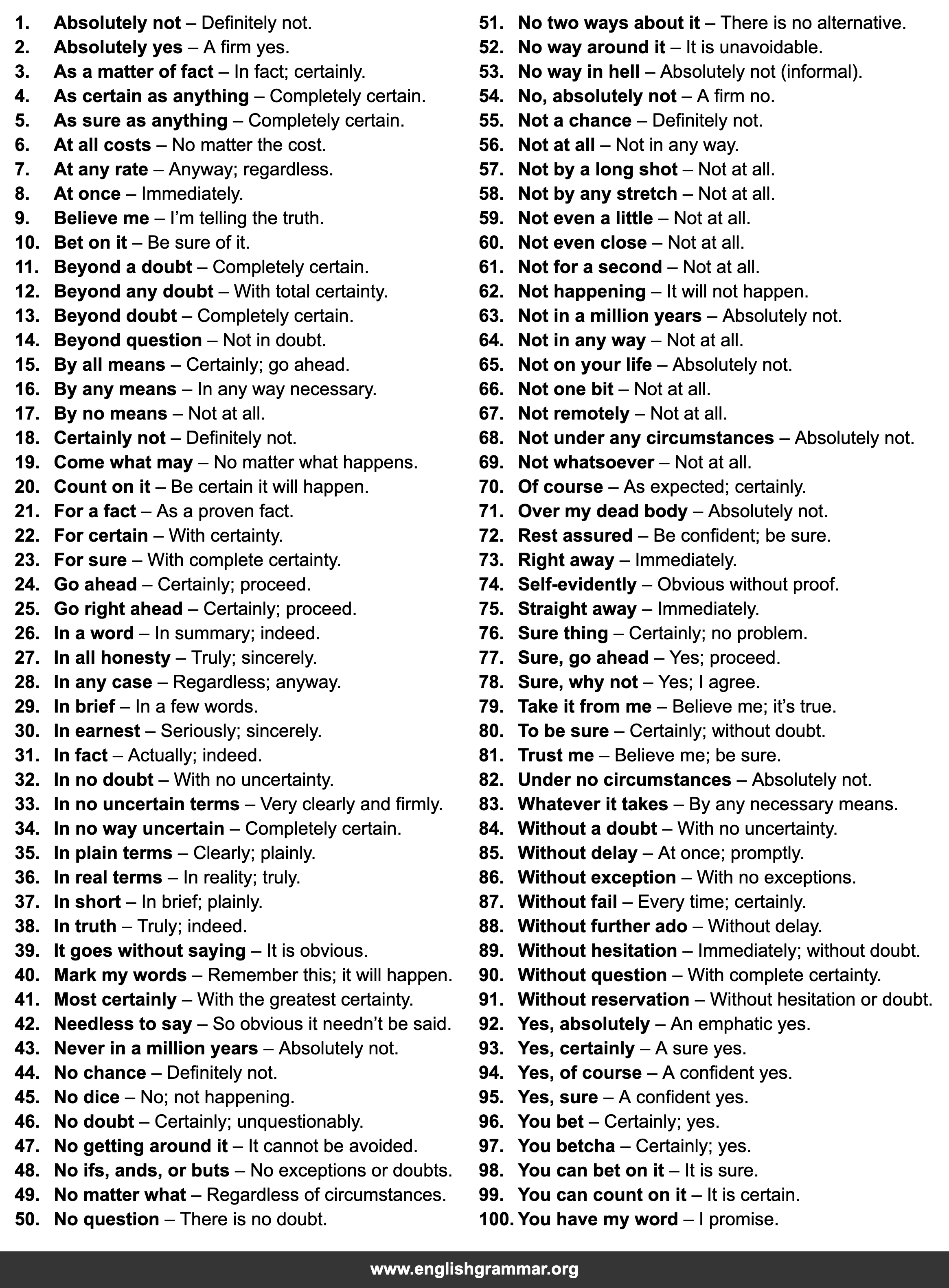 | 33. | In no uncertain terms | Very clearly and firmly. |