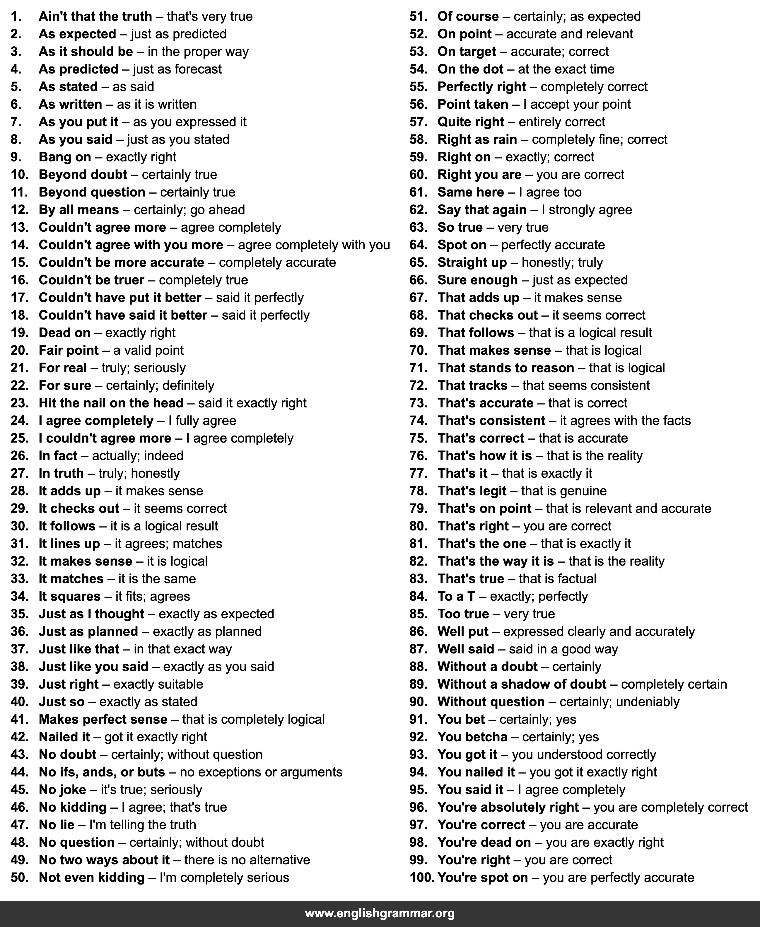 | 14. | Couldn’t agree with you more | agree completely with you |