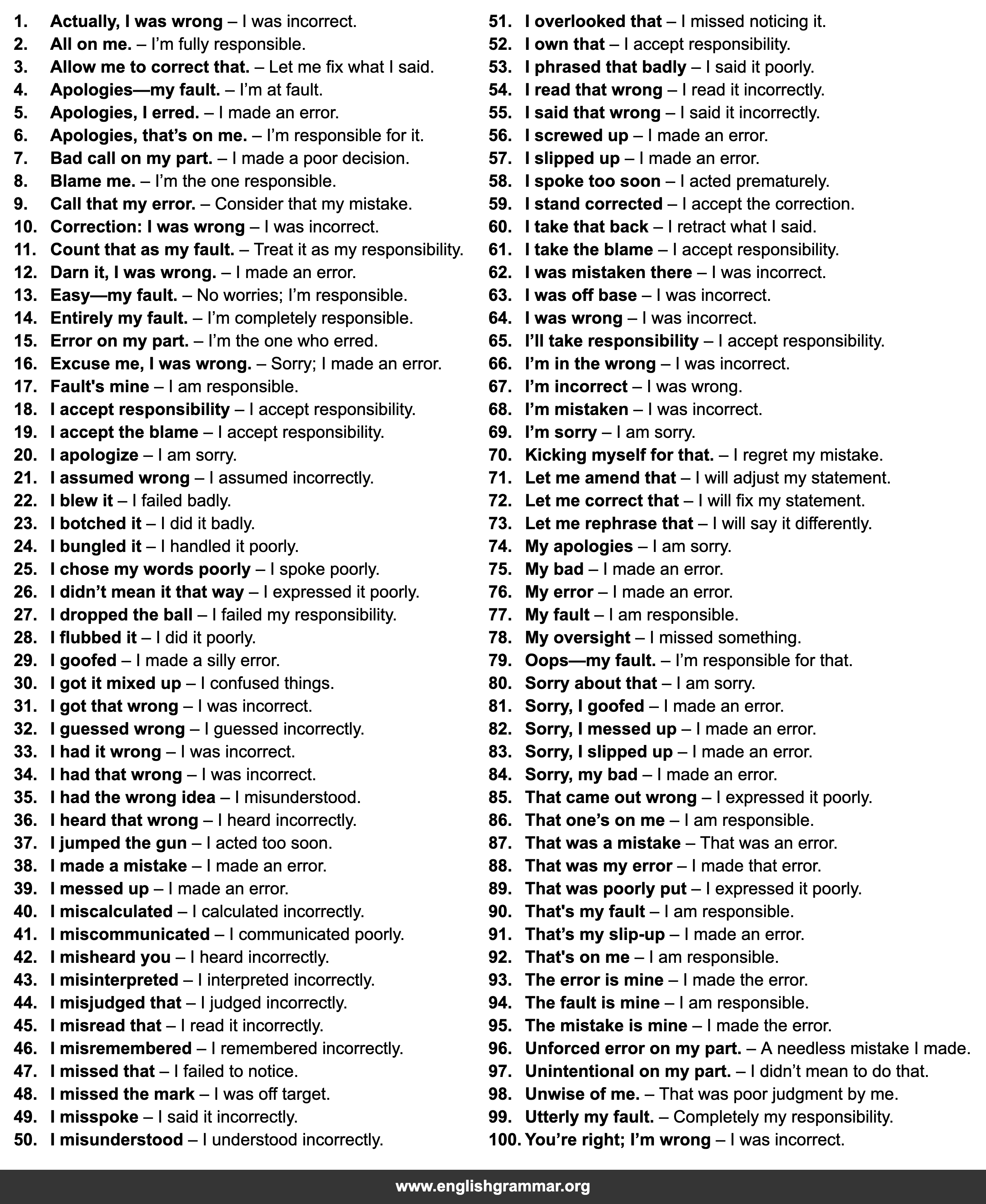 | 100. | You’re right; I’m wrong | I was incorrect. |