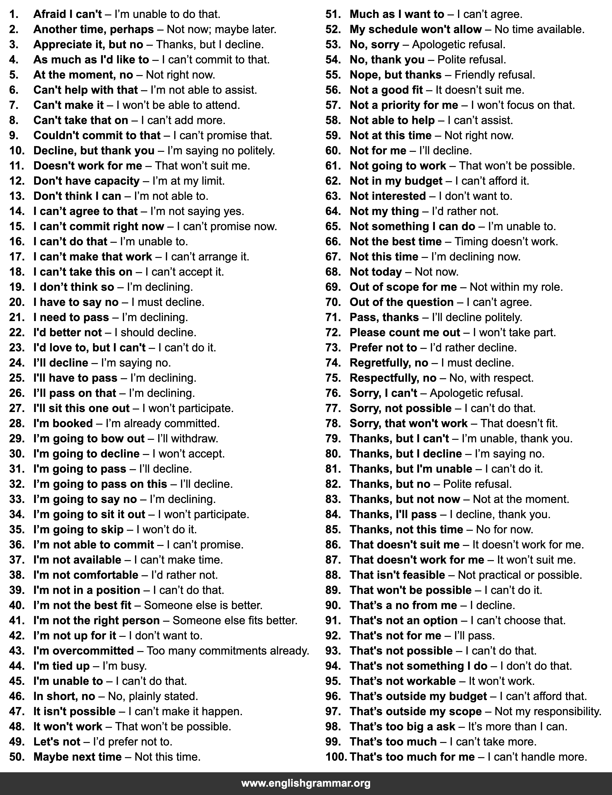 | 3. | Appreciate it, but no | Thanks, but I decline. |