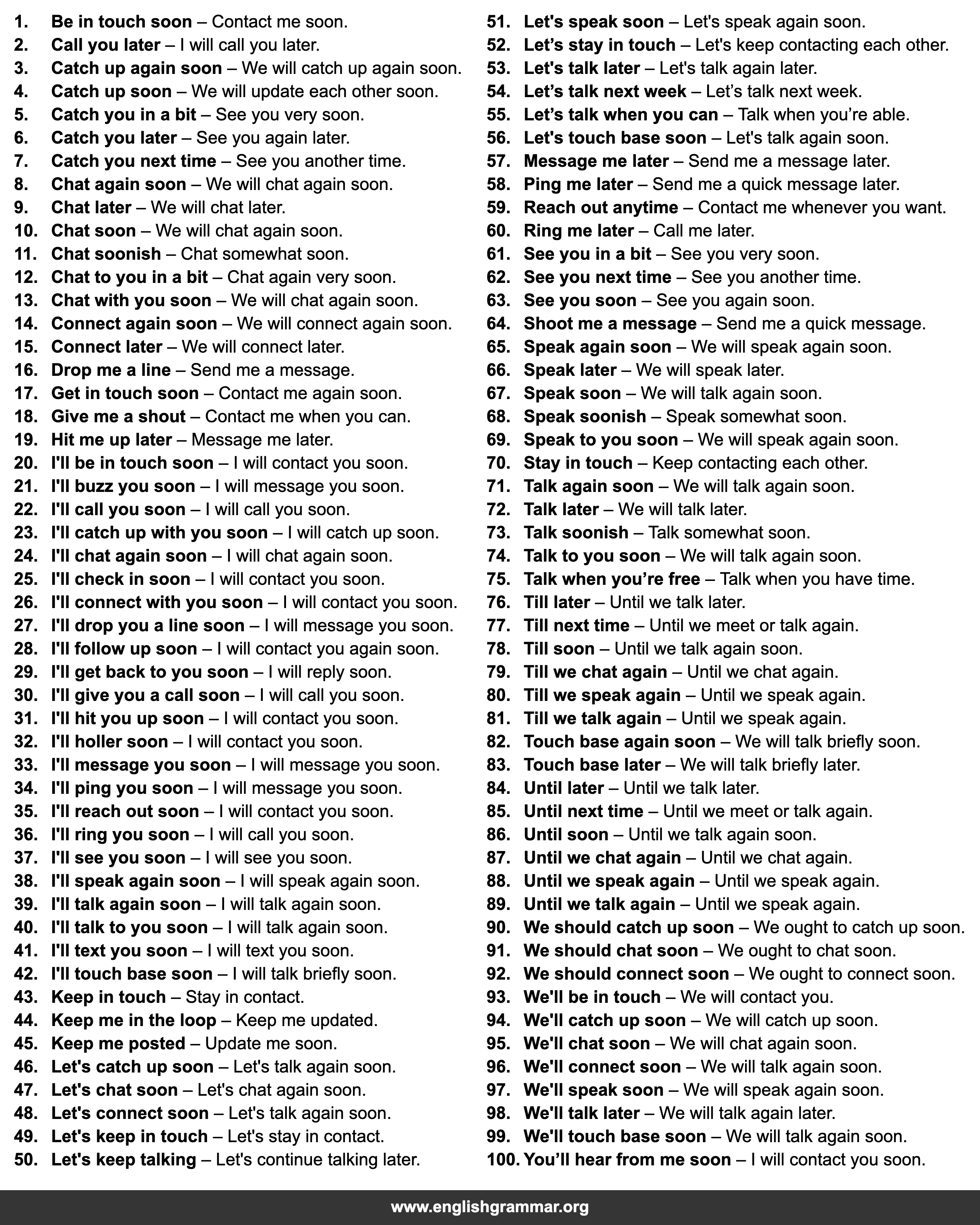 | 97. | We’ll speak soon | We will speak again soon. |