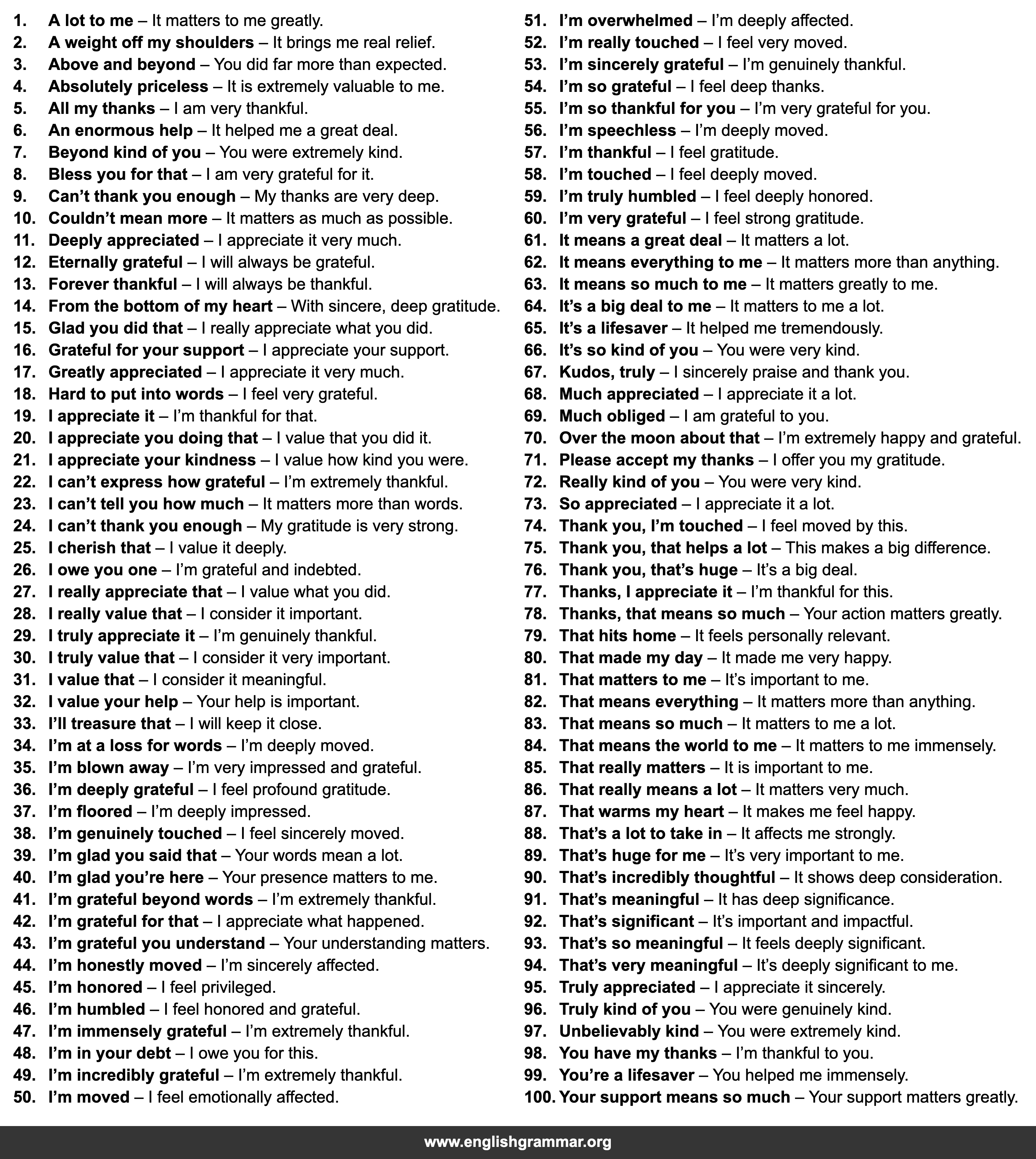 | 41. | I’m grateful beyond words | I’m extremely thankful. |