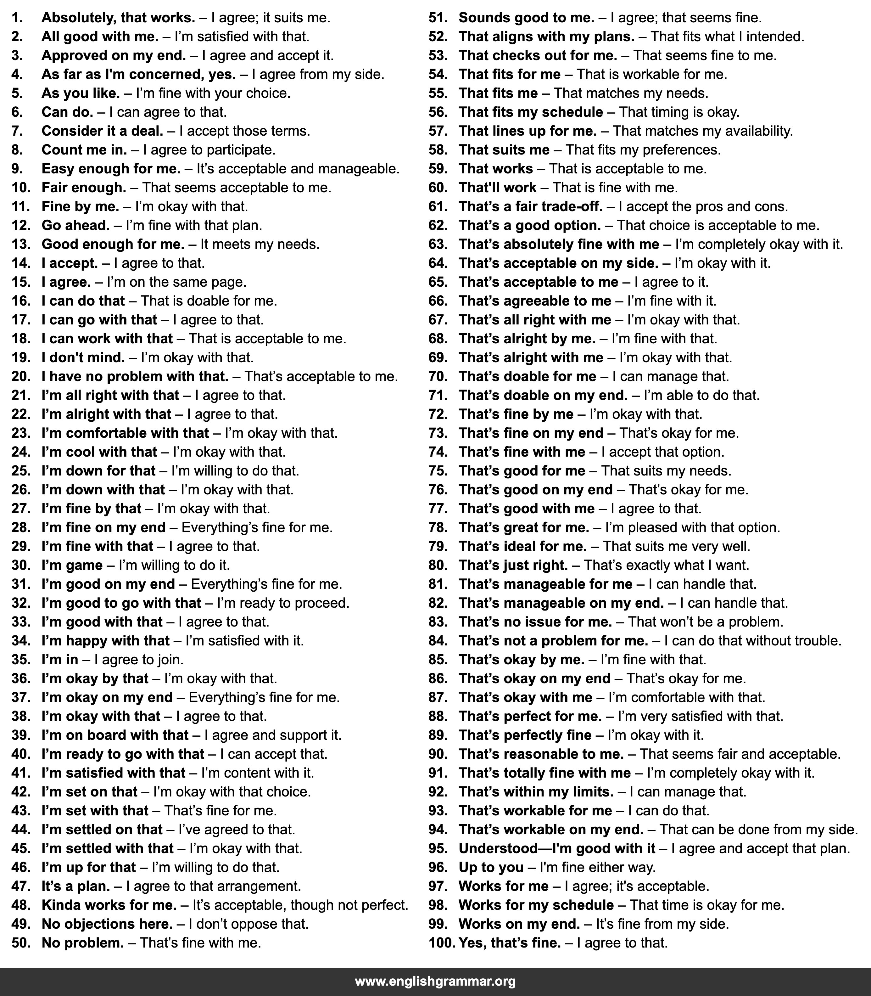 | 87. | That’s okay with me | I’m comfortable with that. |