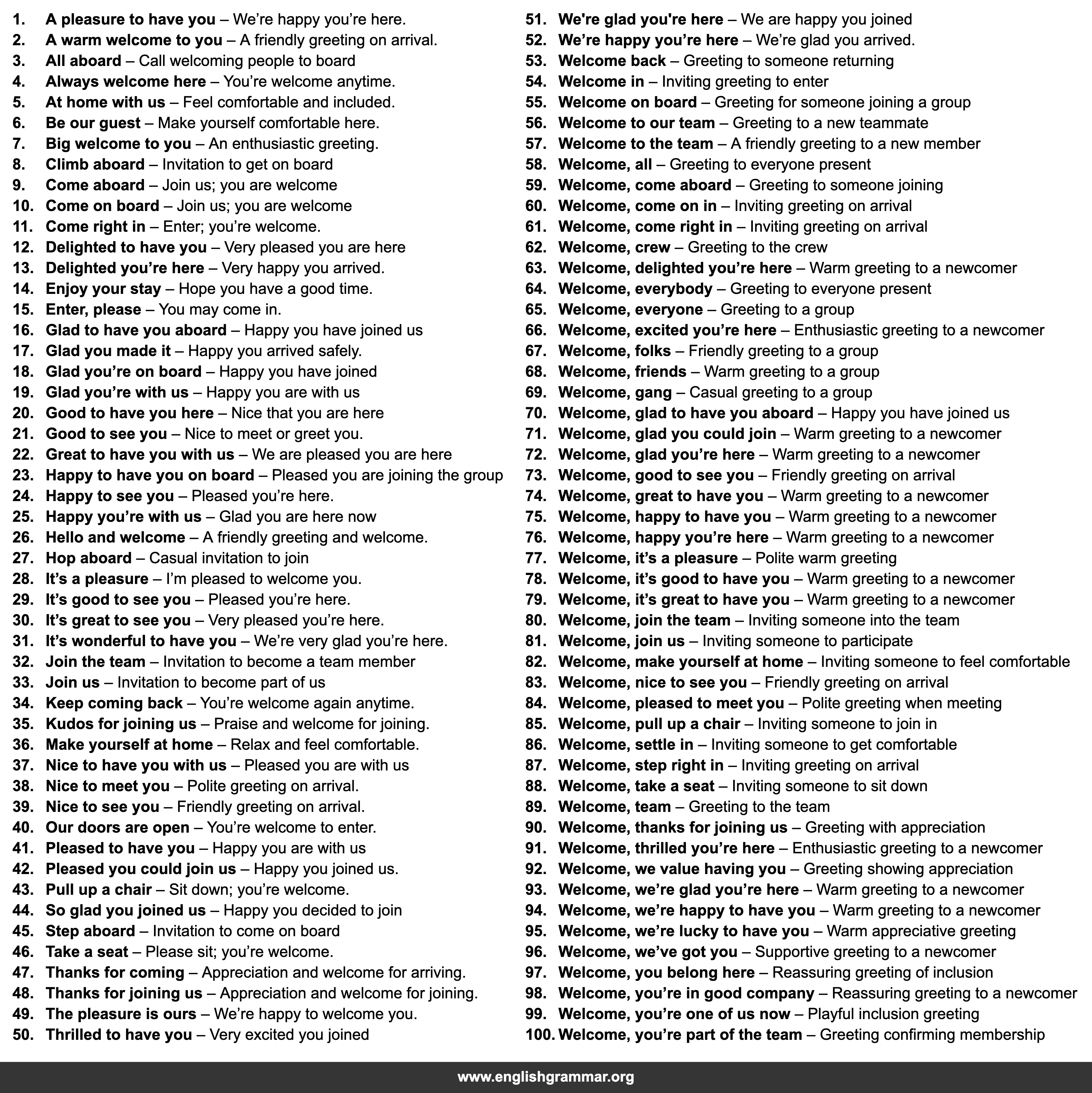 | 100. | Welcome, you’re part of the team | Greeting confirming membership |