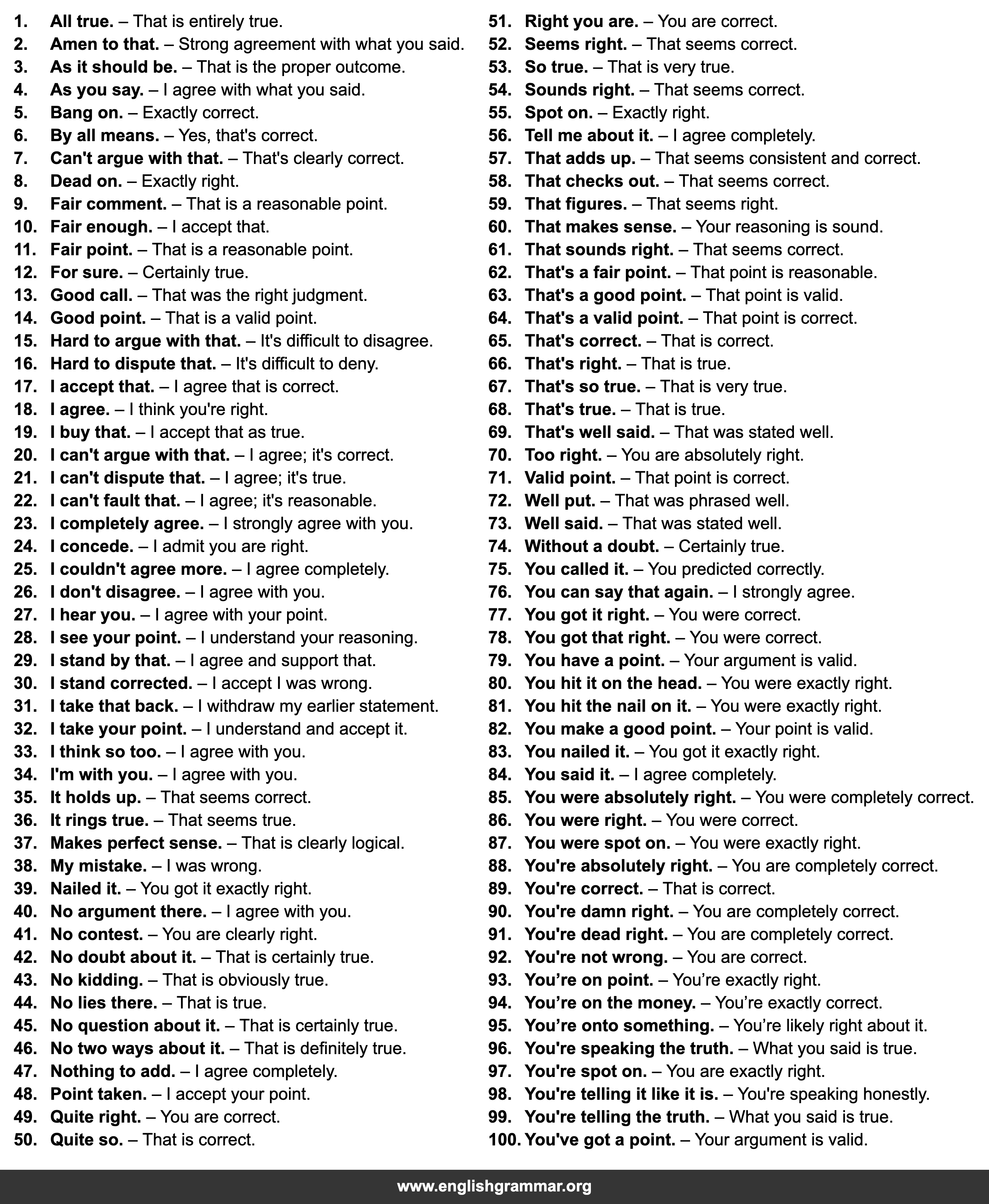 | 20. | I can’t argue with that. | I agree; it’s correct. |
