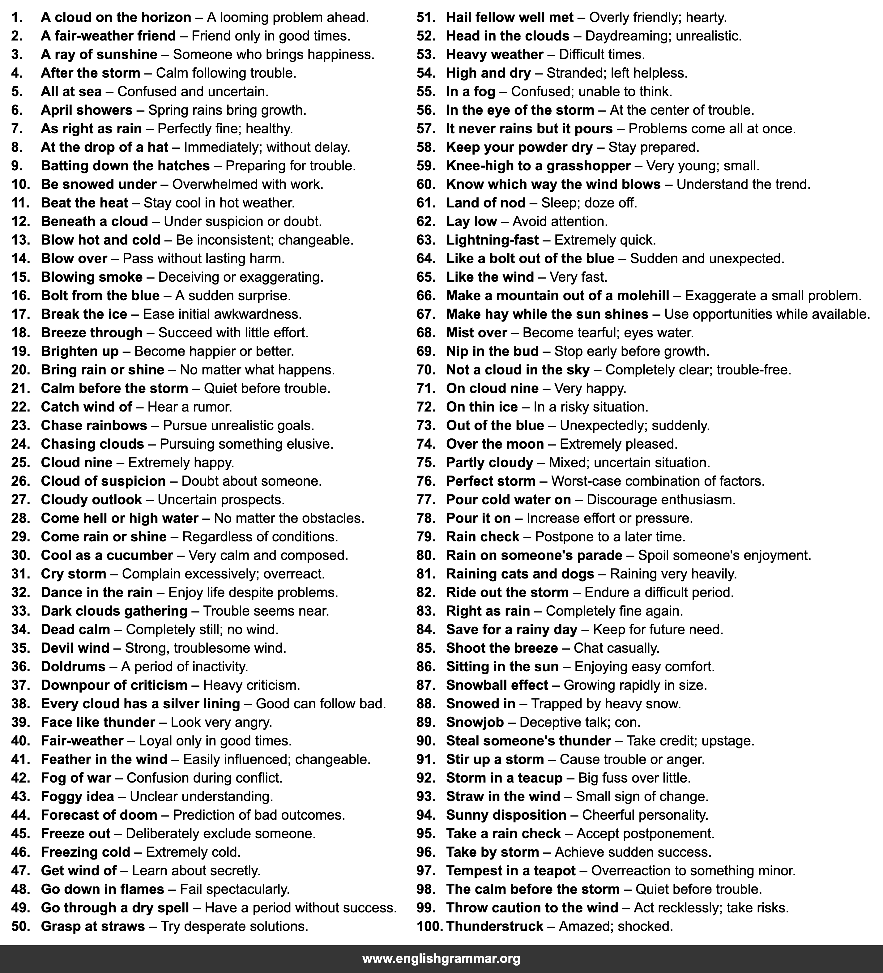 | 81. | Raining cats and dogs | Raining very heavily. |