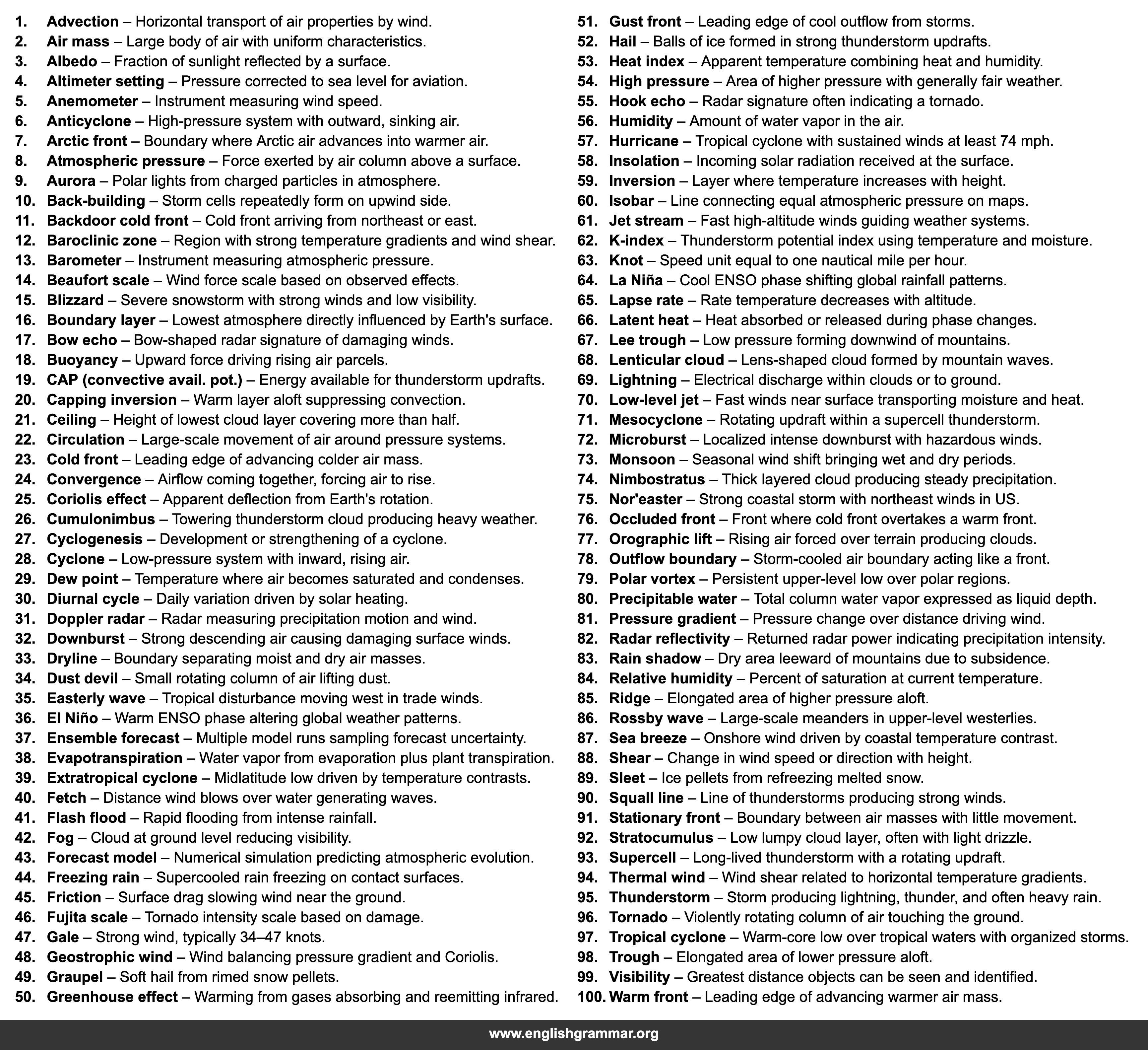 | 6. | Anticyclone | High-pressure system with outward, sinking air. |