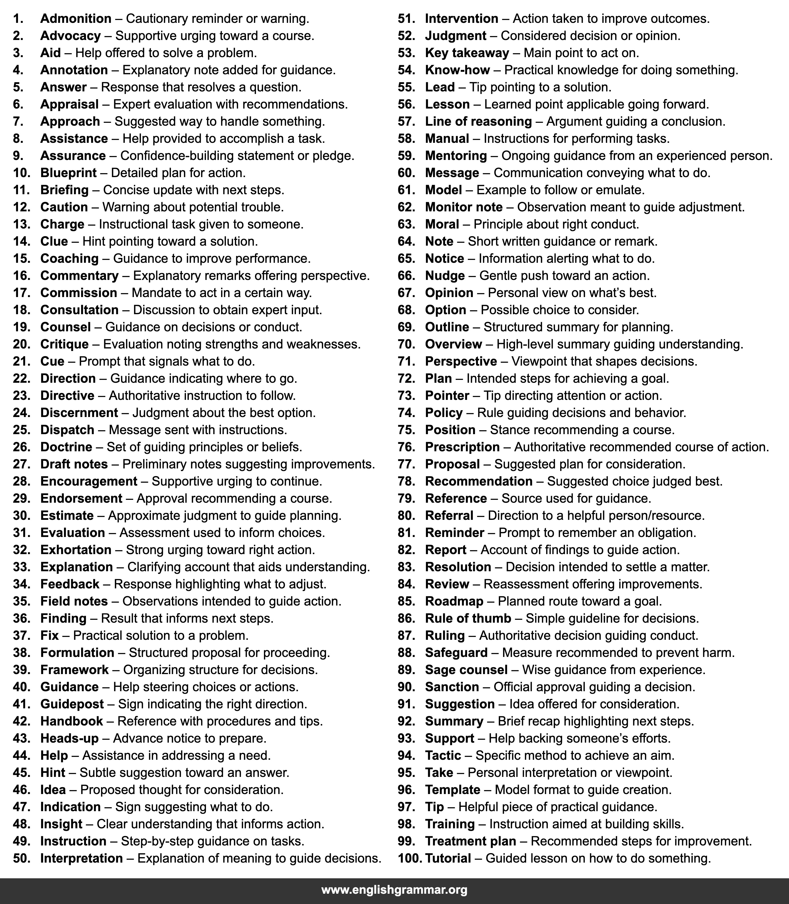 | 19. | Counsel | Guidance on decisions or conduct. |