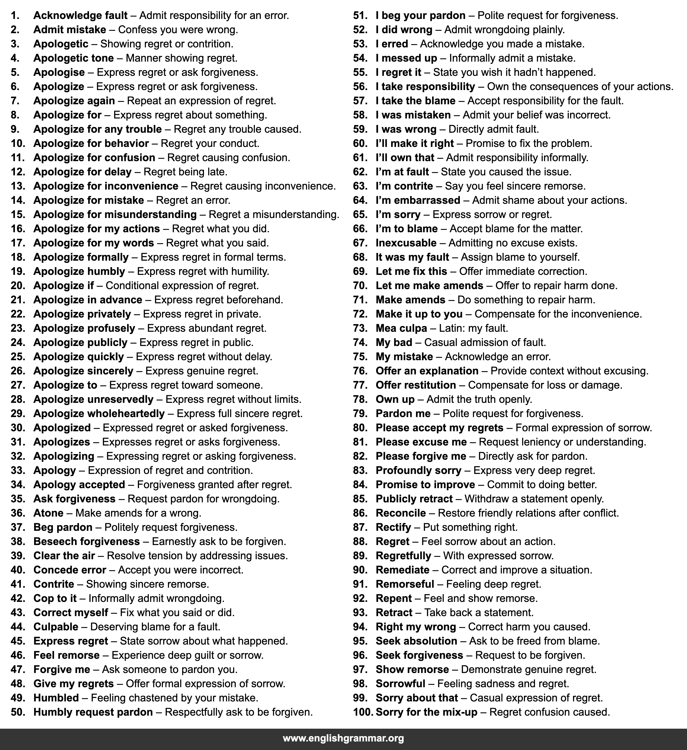 | 50. | Humbly request pardon | Respectfully ask to be forgiven. |