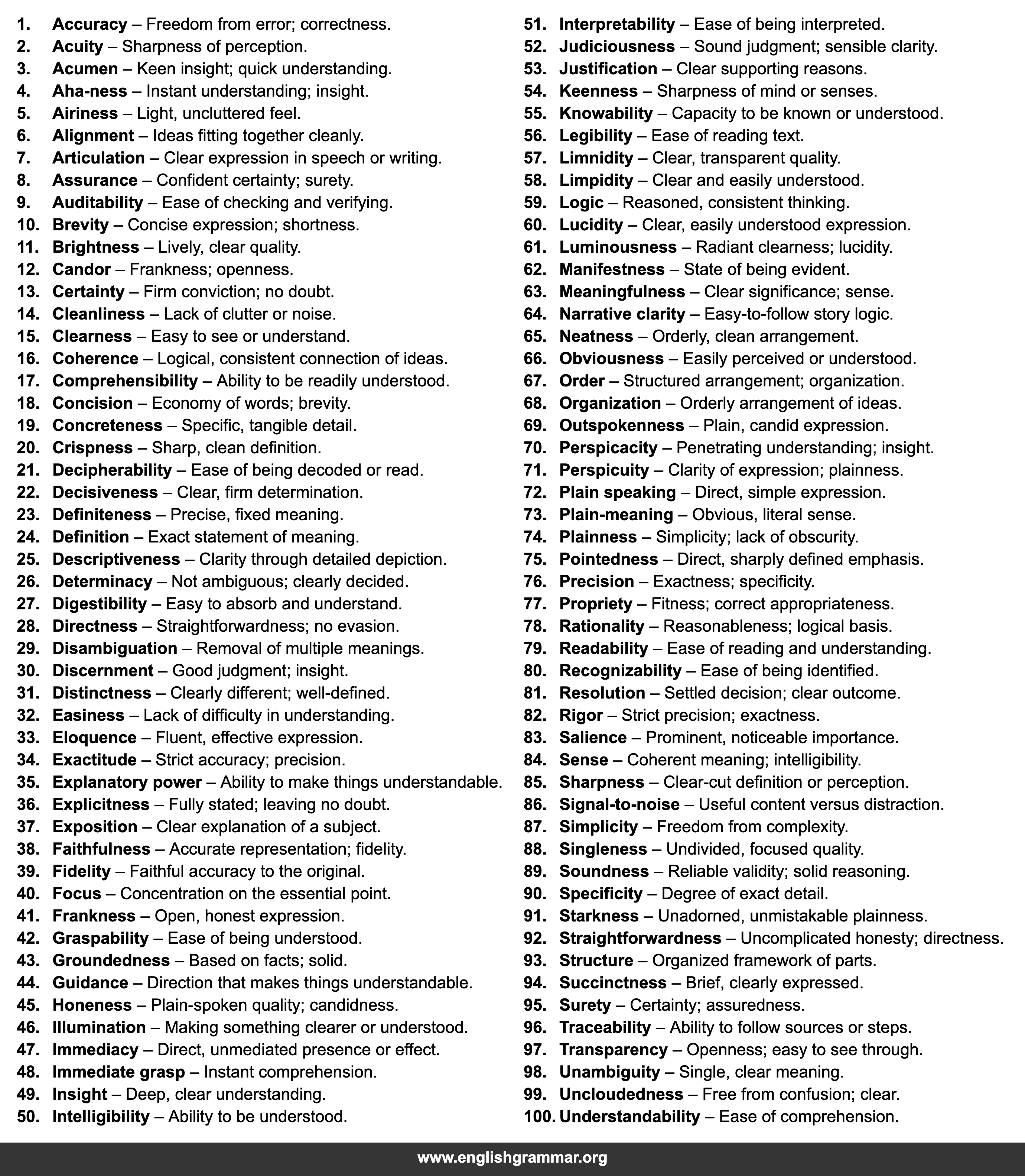 | 60. | Lucidity | Clear, easily understood expression. |