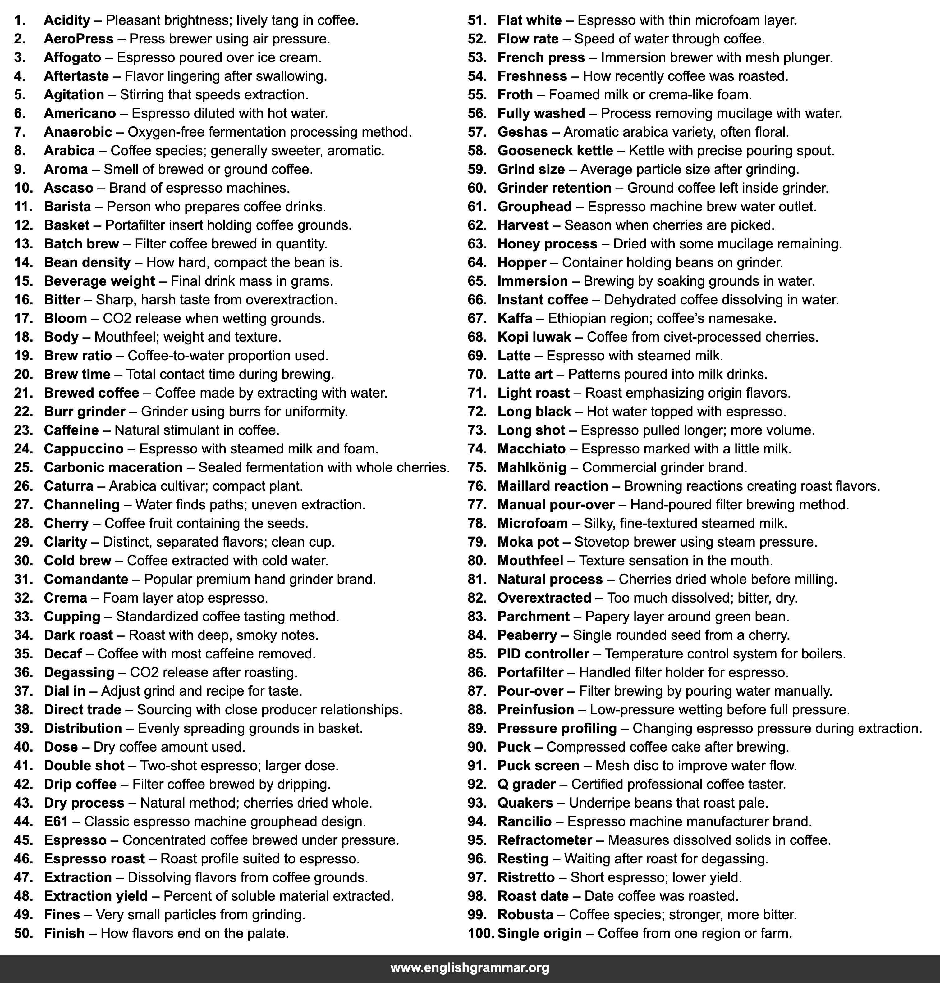 | 99. | Robusta | Coffee species; stronger, more bitter. |