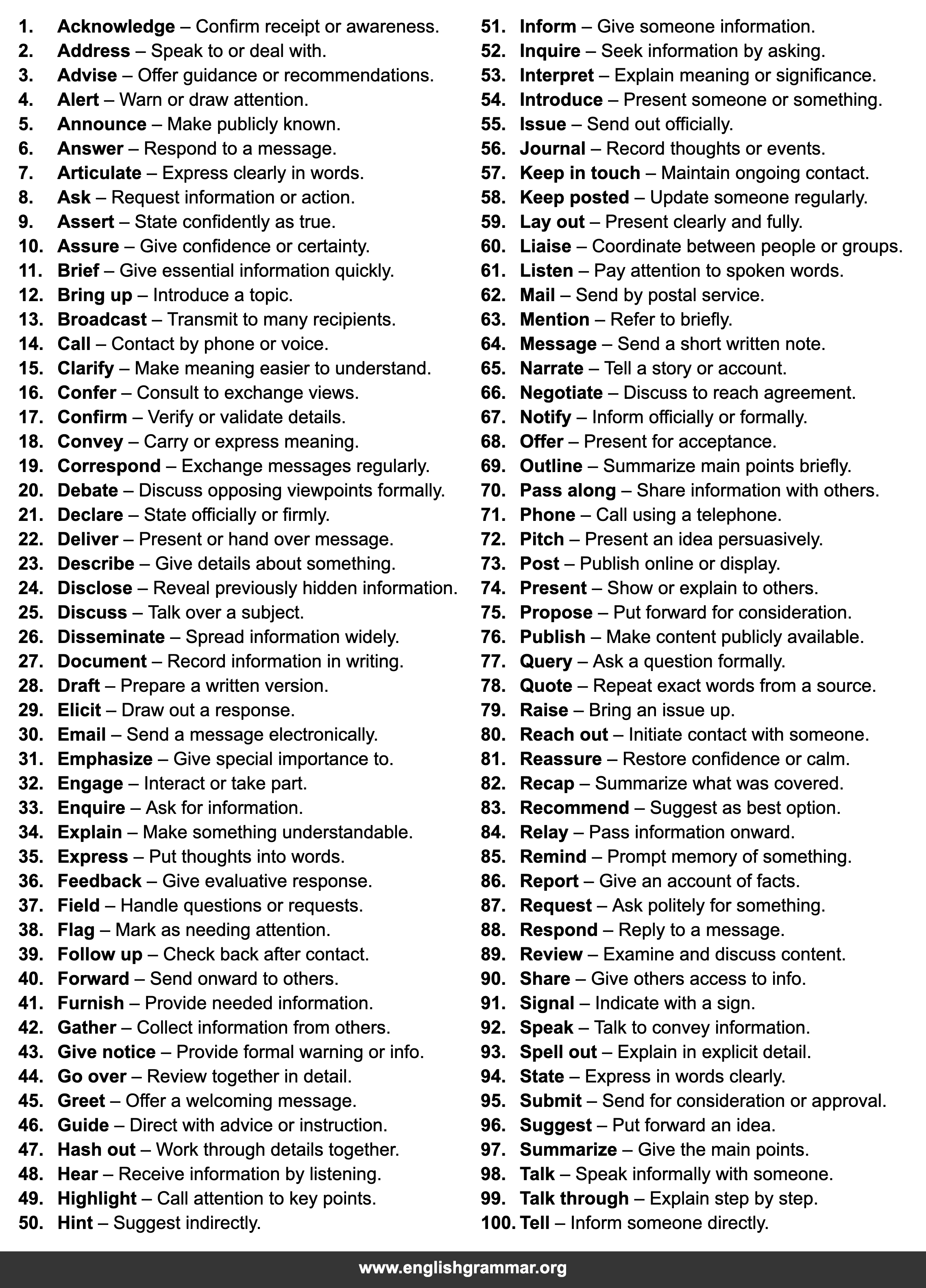 | 100. | Tell | Inform someone directly. |