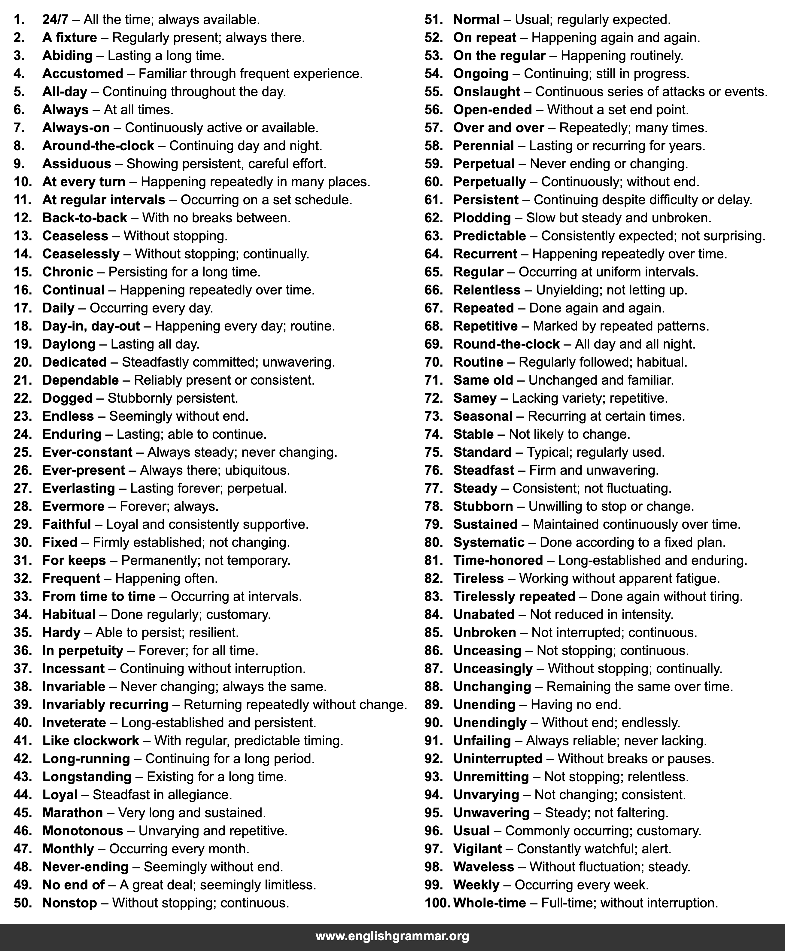 | 39. | Invariably recurring | Returning repeatedly without change. |
