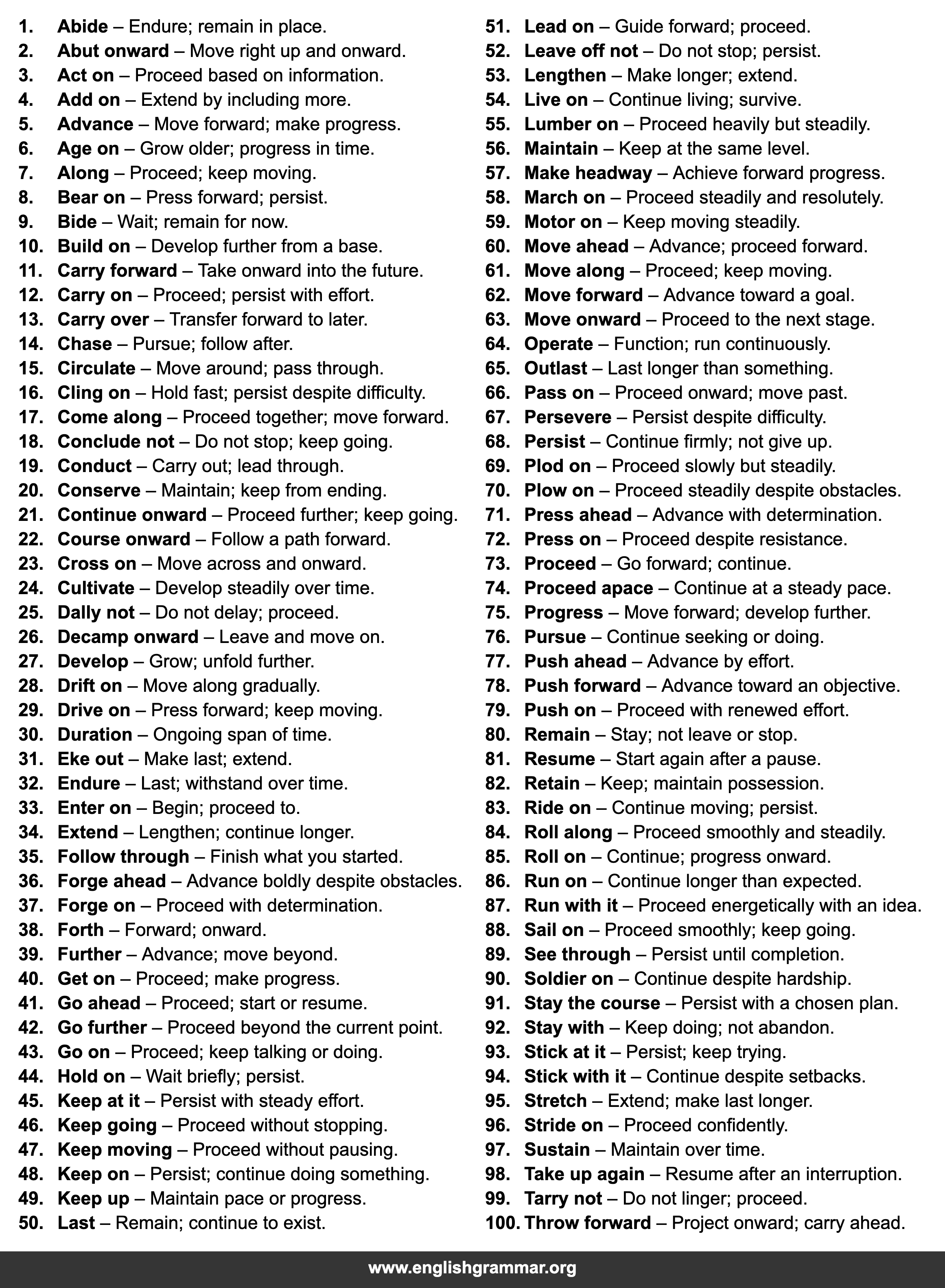 | 58. | March on | Proceed steadily and resolutely. |