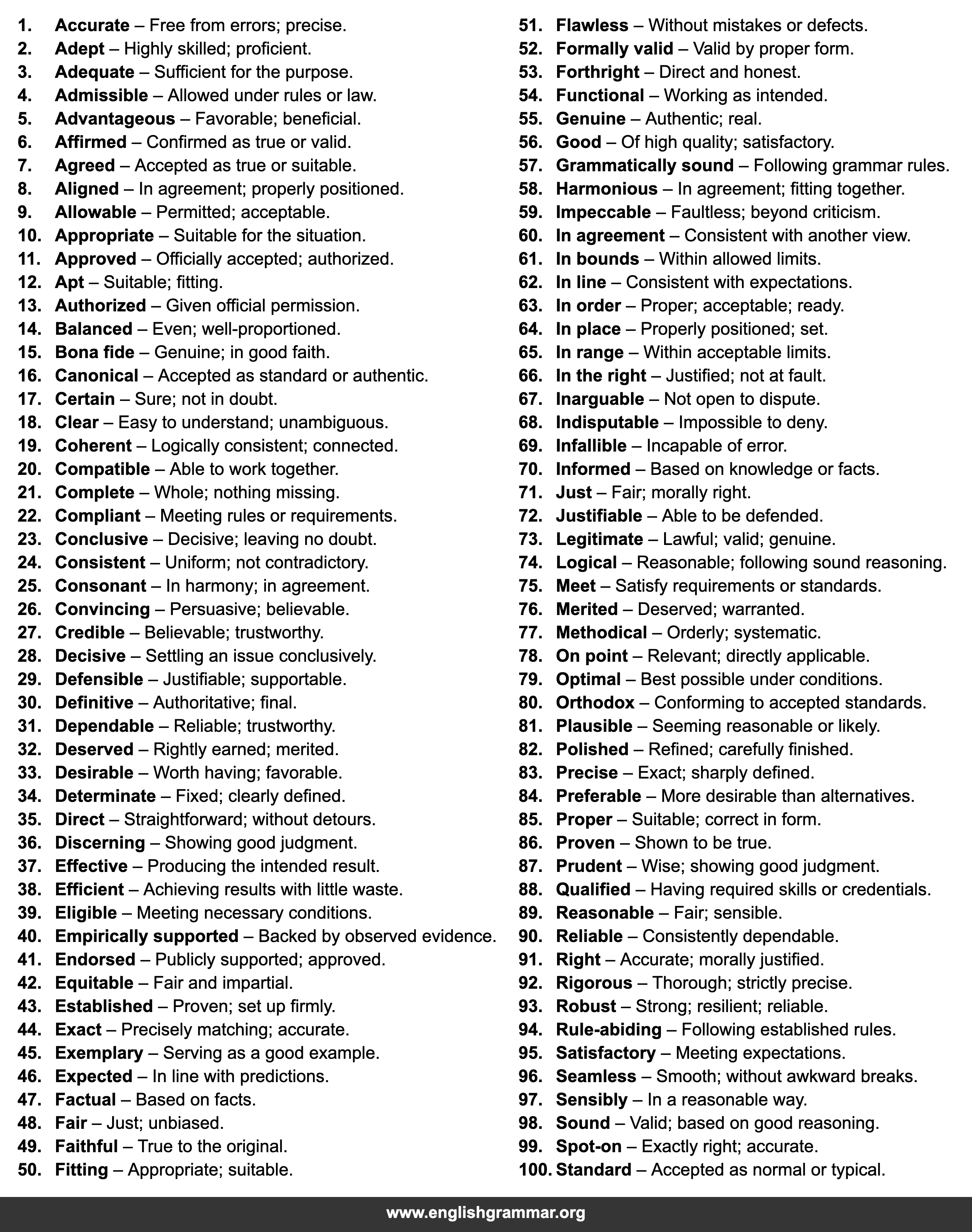 | 73. | Legitimate | Lawful; valid; genuine. |