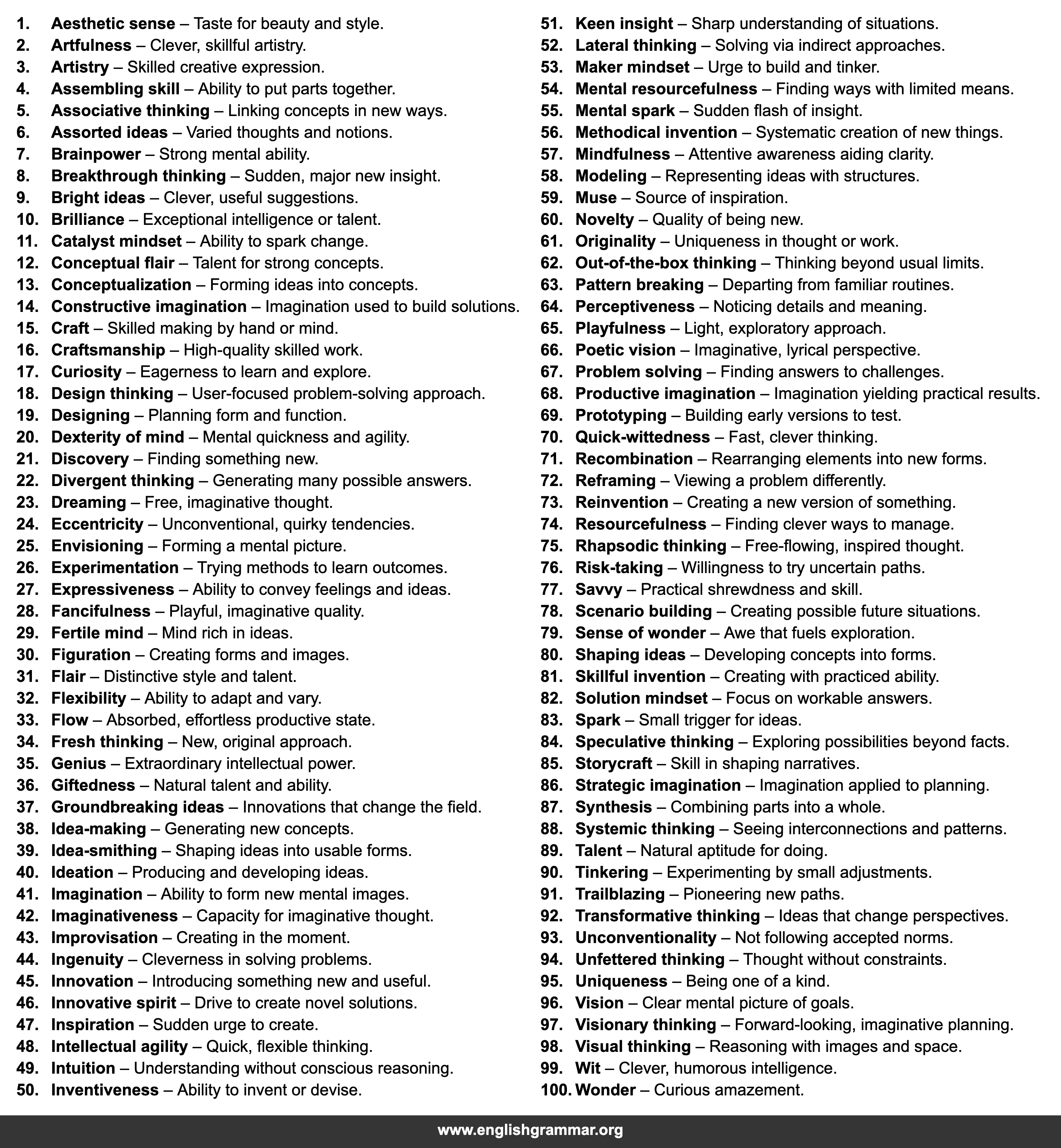 | 61. | Originality | Uniqueness in thought or work. |