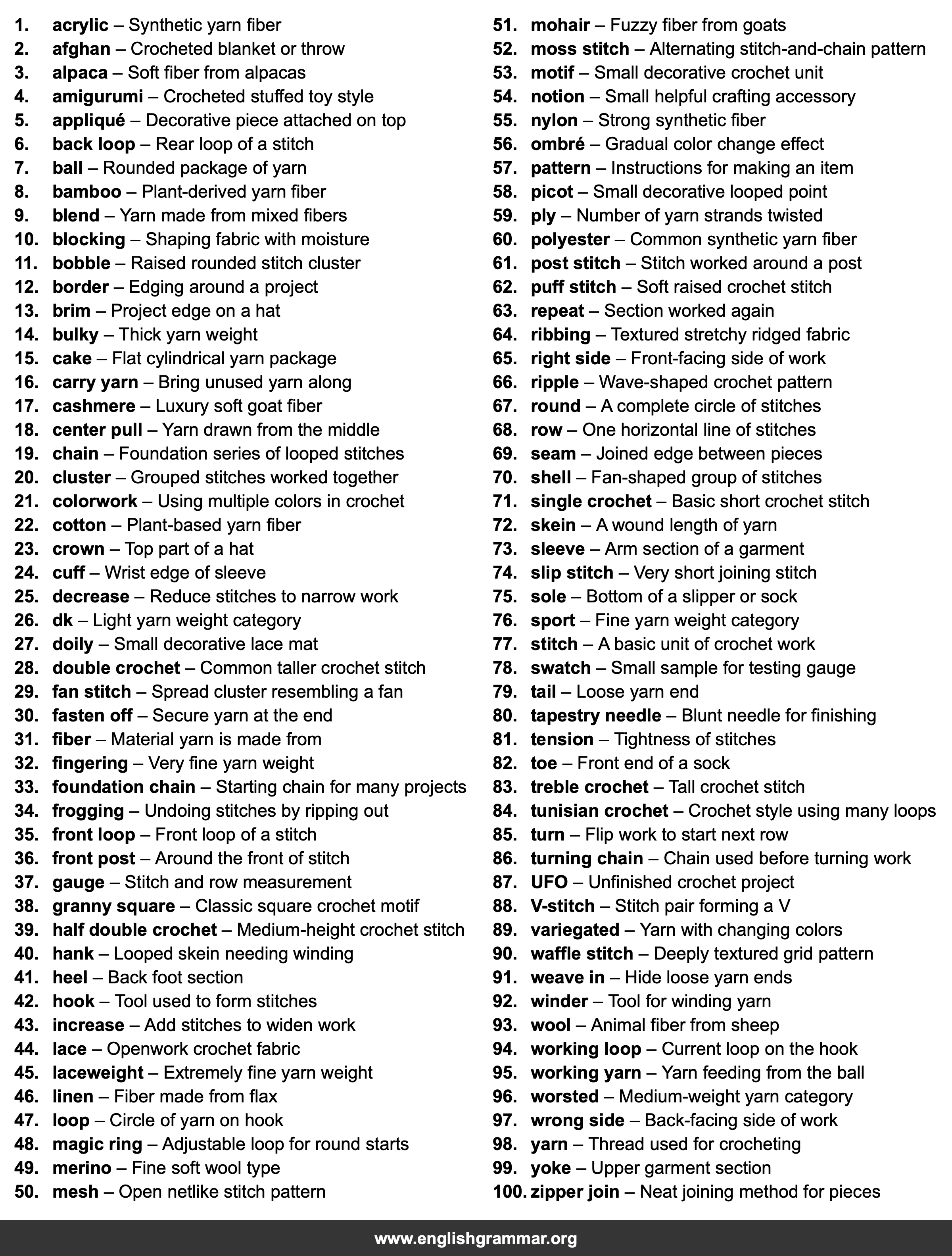 | 28. | double crochet | Common taller crochet stitch |