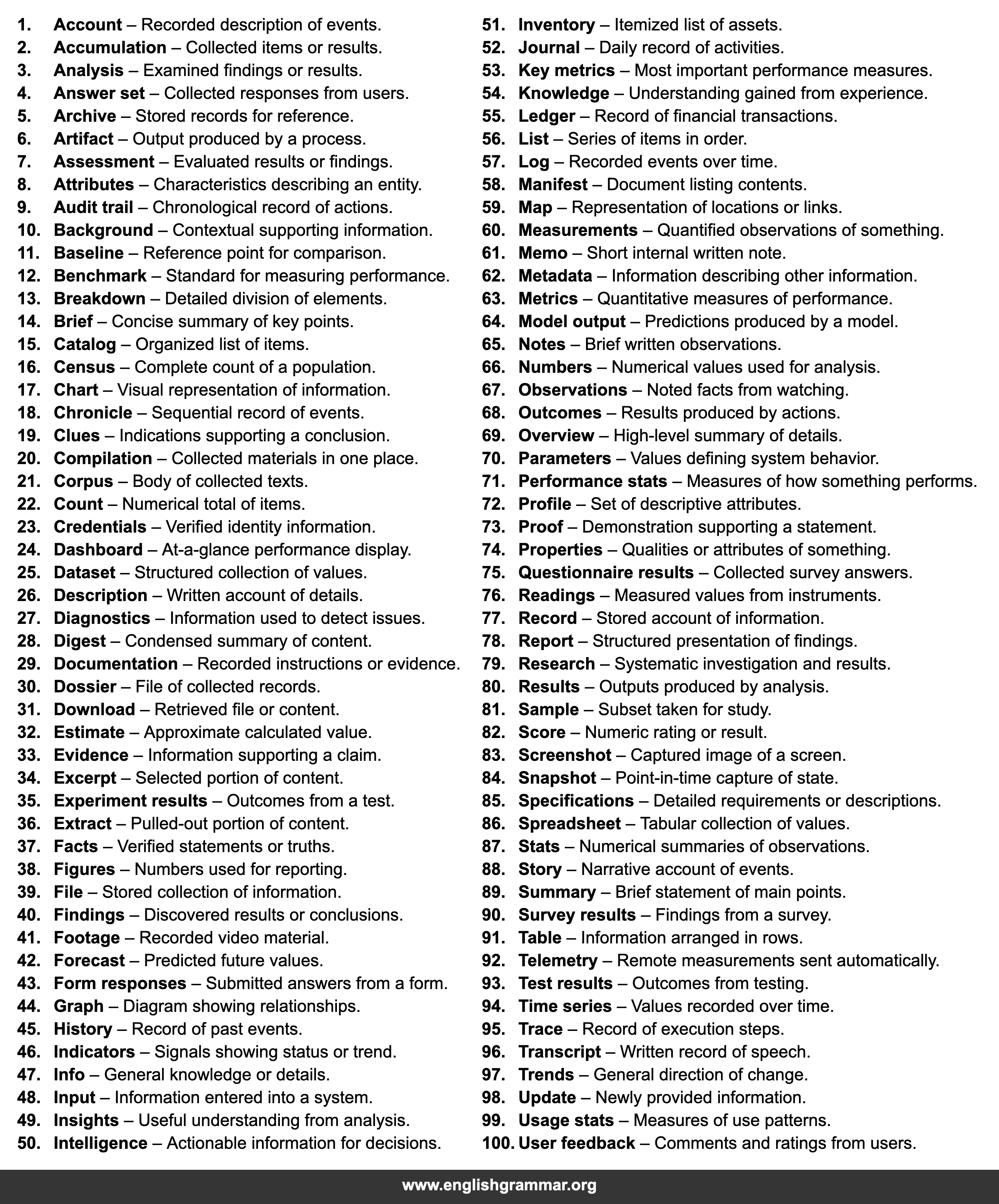 | 85. | Specifications | Detailed requirements or descriptions. |