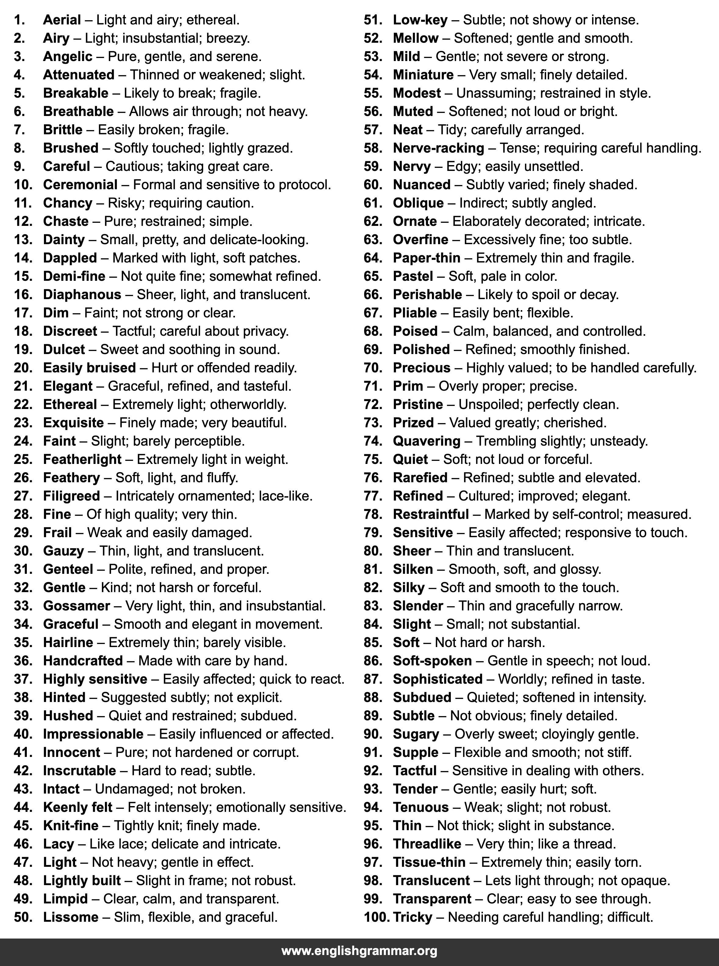 | 33. | Gossamer | Very light, thin, and insubstantial. |