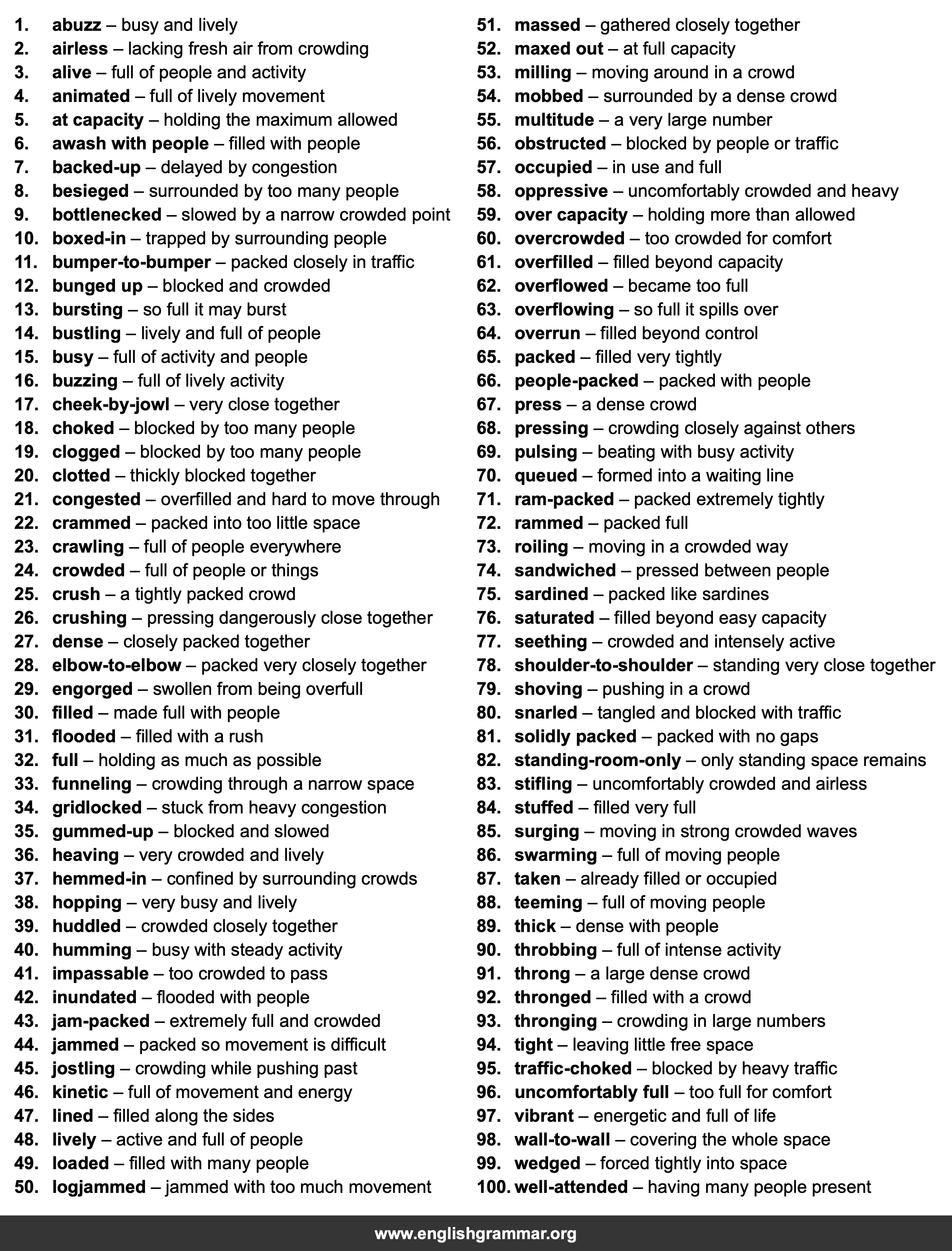 | 11. | bumper-to-bumper | packed closely in traffic |