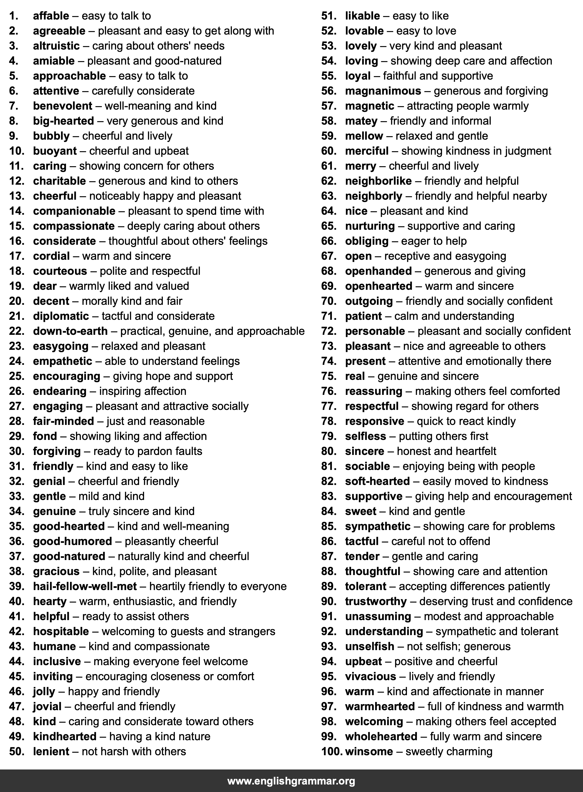| 98. | welcoming | making others feel accepted |