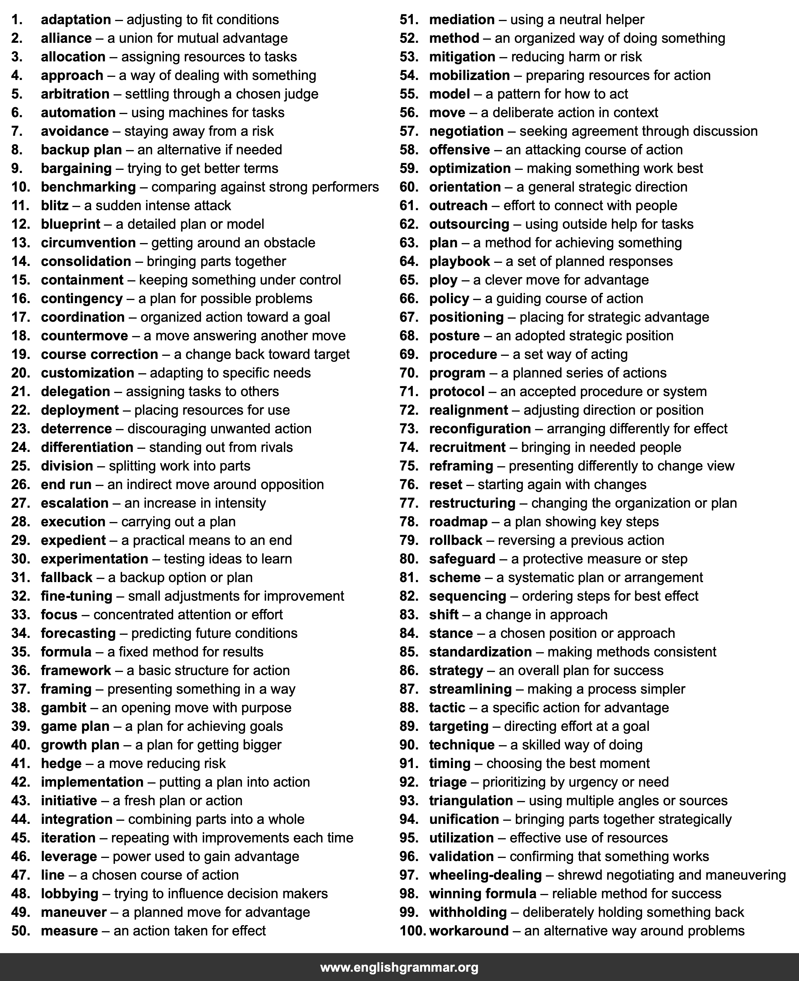 | 49. | maneuver | a planned move for advantage |