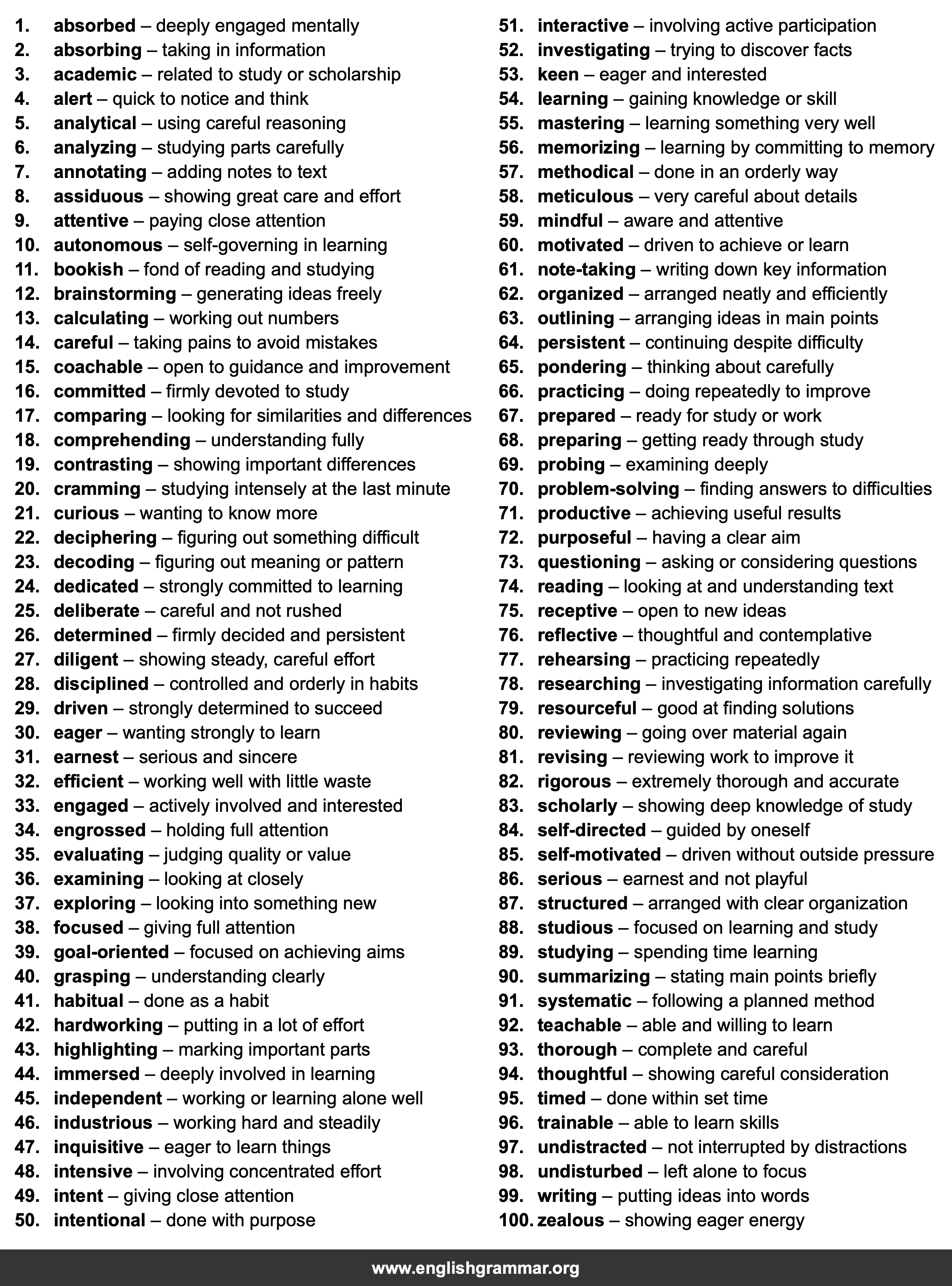 | 60. | motivated | driven to achieve or learn |