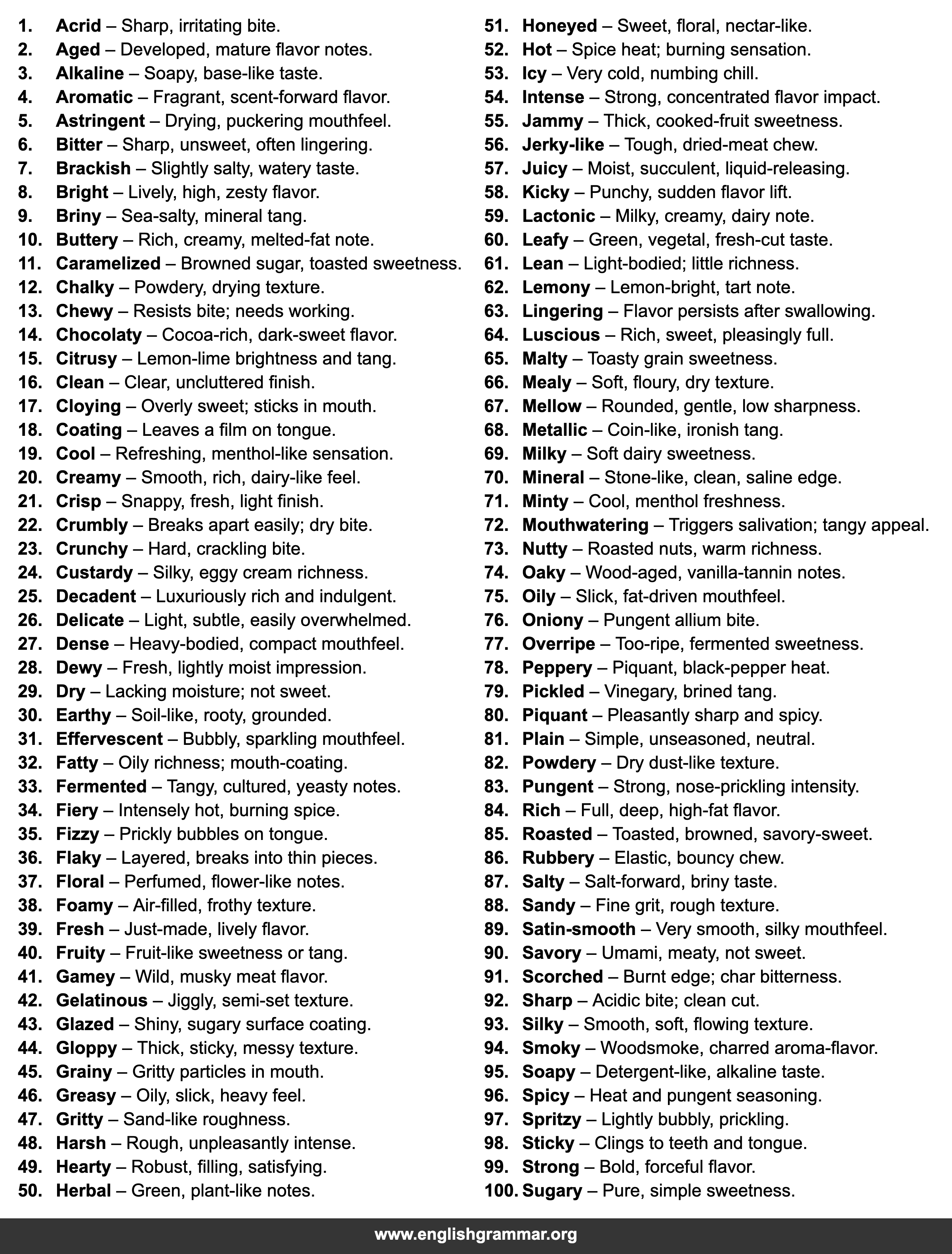 | 17. | Cloying | Overly sweet; sticks in mouth. |