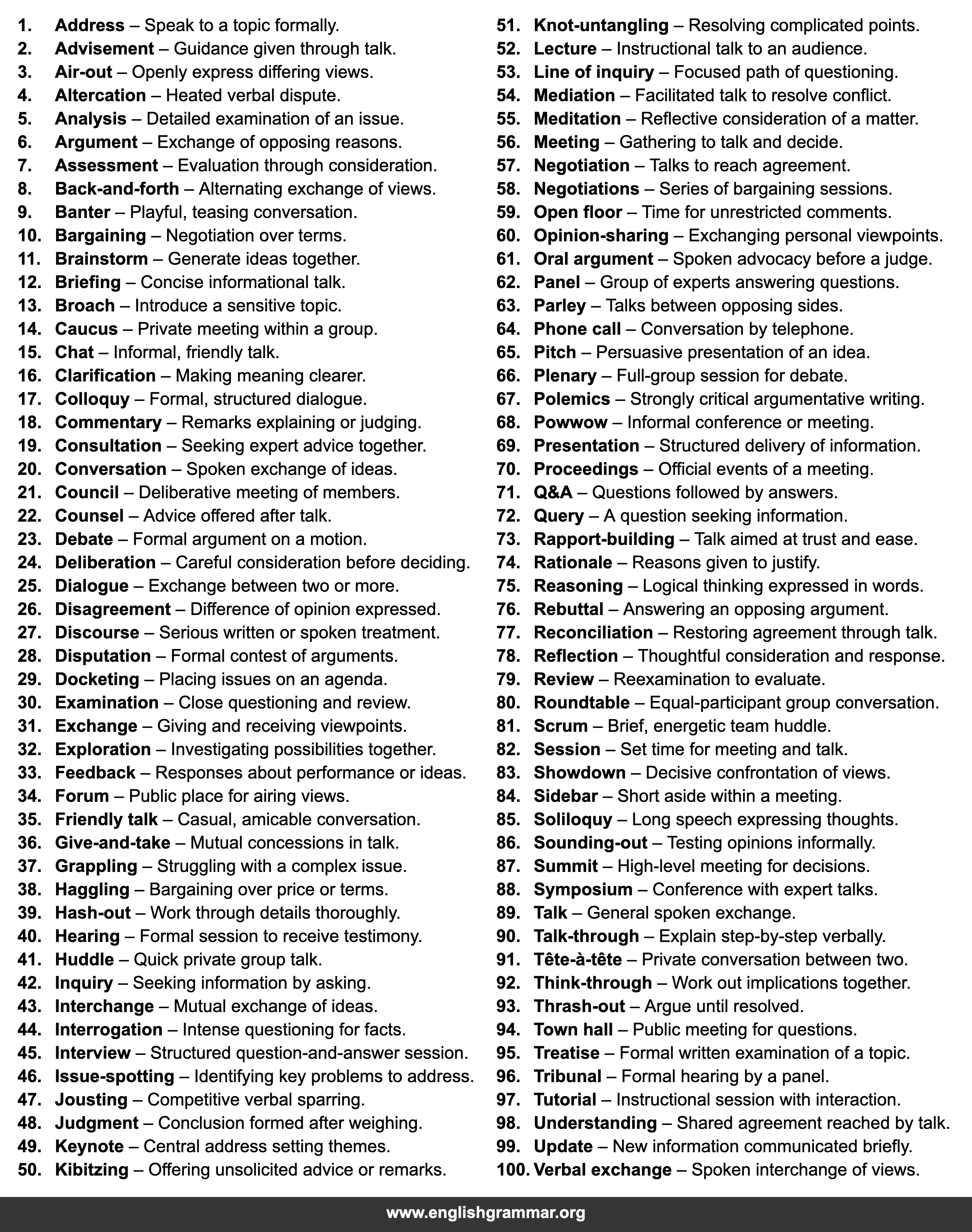 | 100. | Verbal exchange | Spoken interchange of views. |