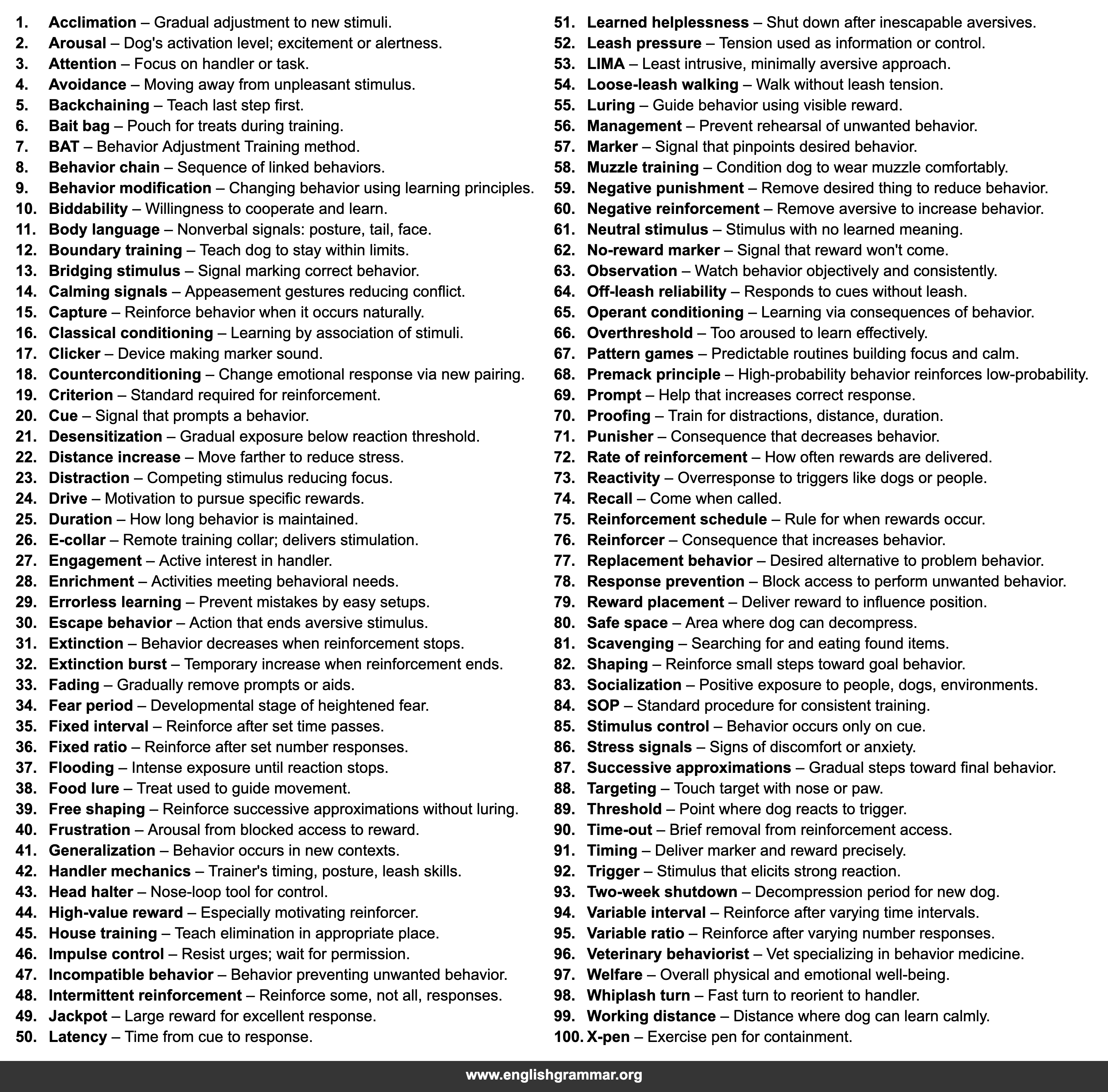 | 89. | Threshold | Point where dog reacts to trigger. |
