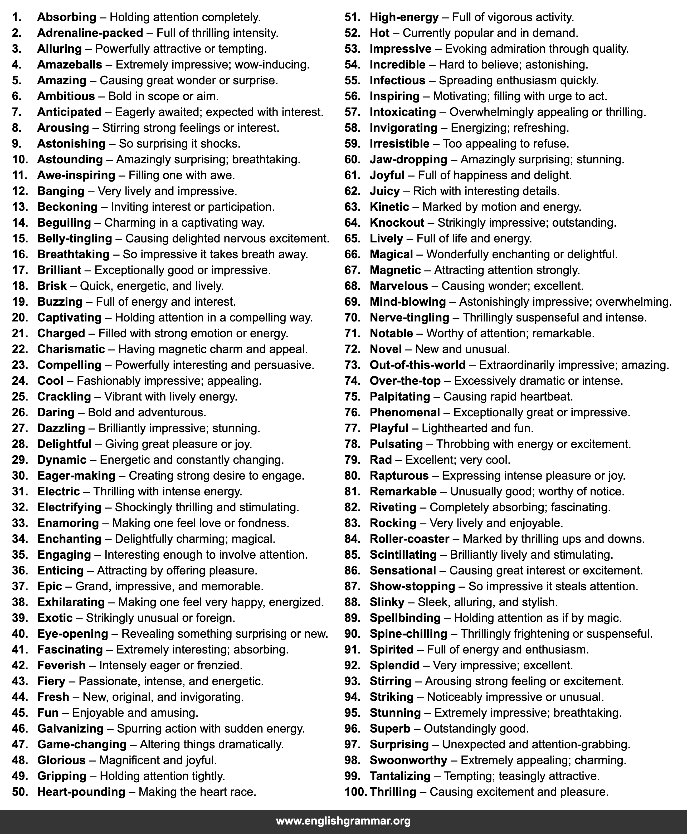 | 100. | Thrilling | Causing excitement and pleasure. |