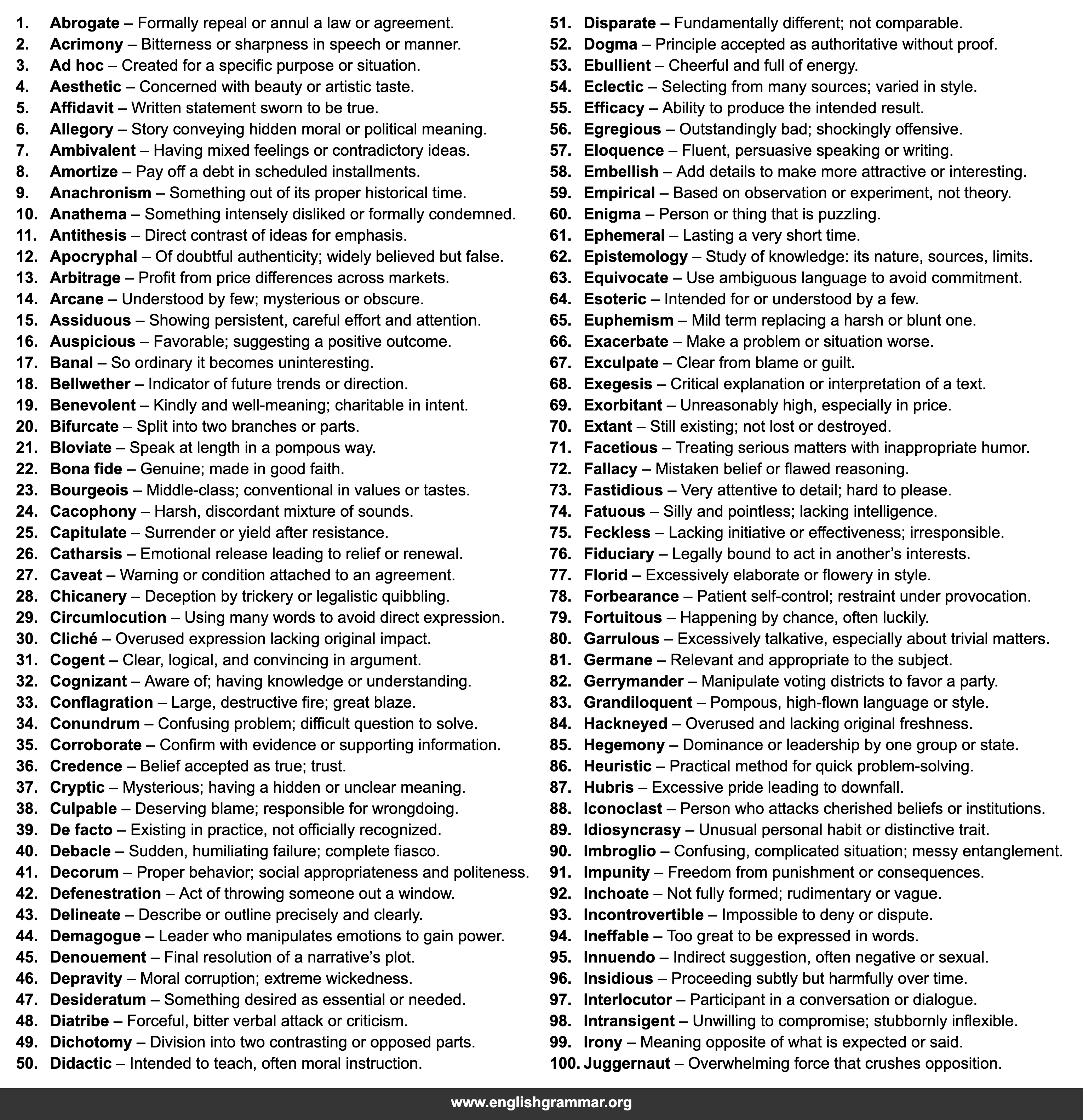 | 83. | Grandiloquent | Pompous, high-flown language or style. |