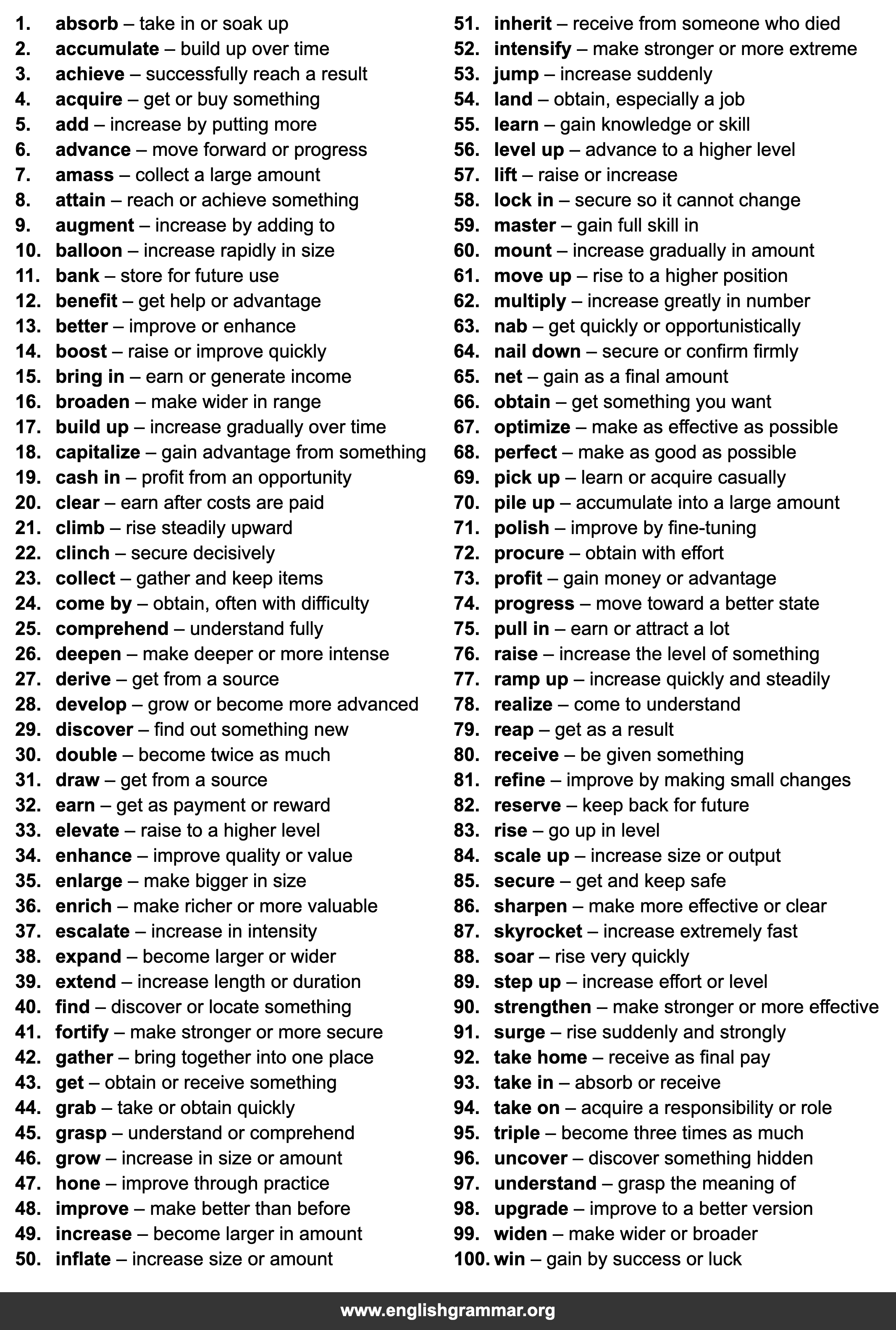 | 49. | increase | become larger in amount |