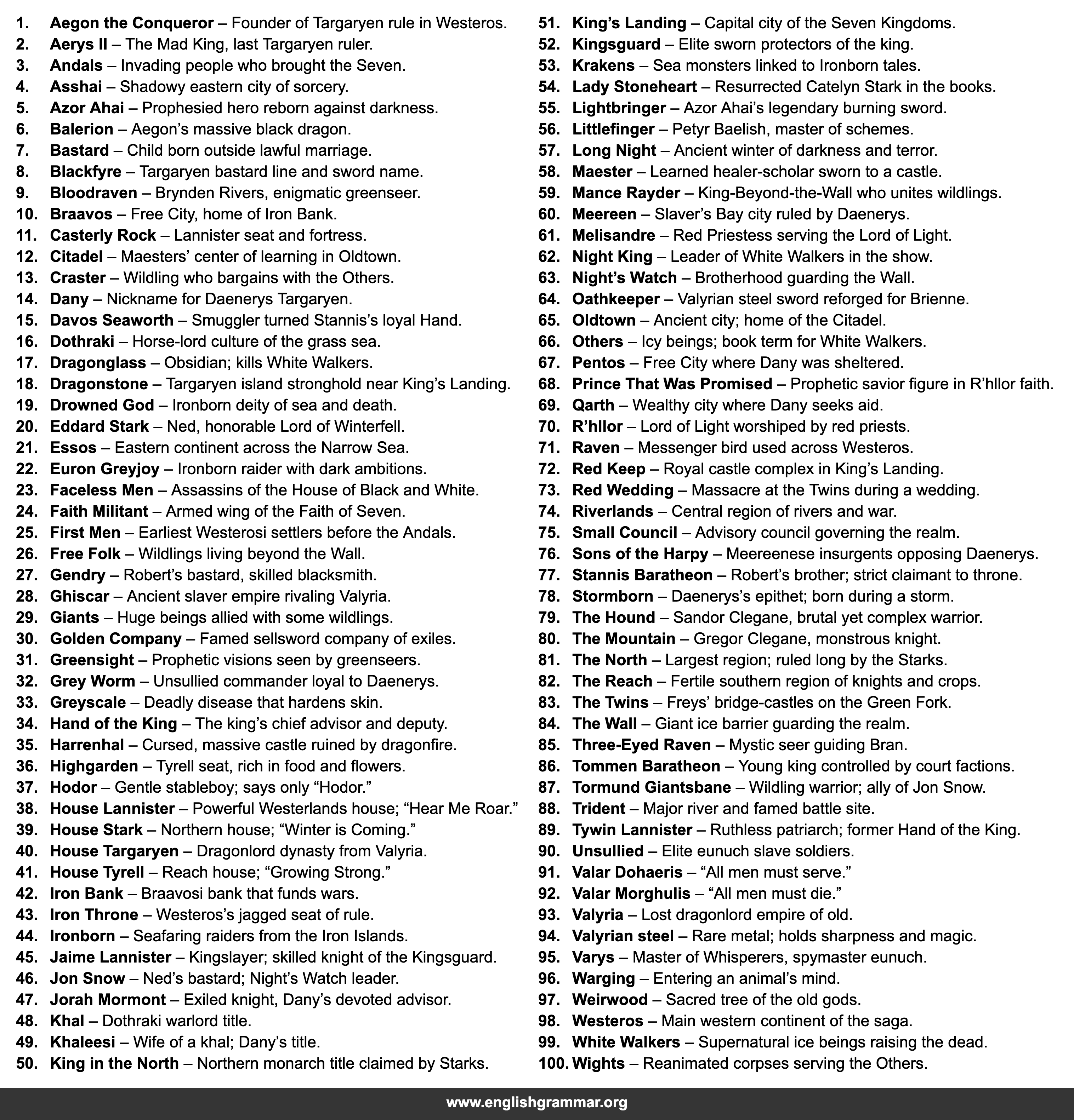 | 51. | King’s Landing | Capital city of the Seven Kingdoms. |