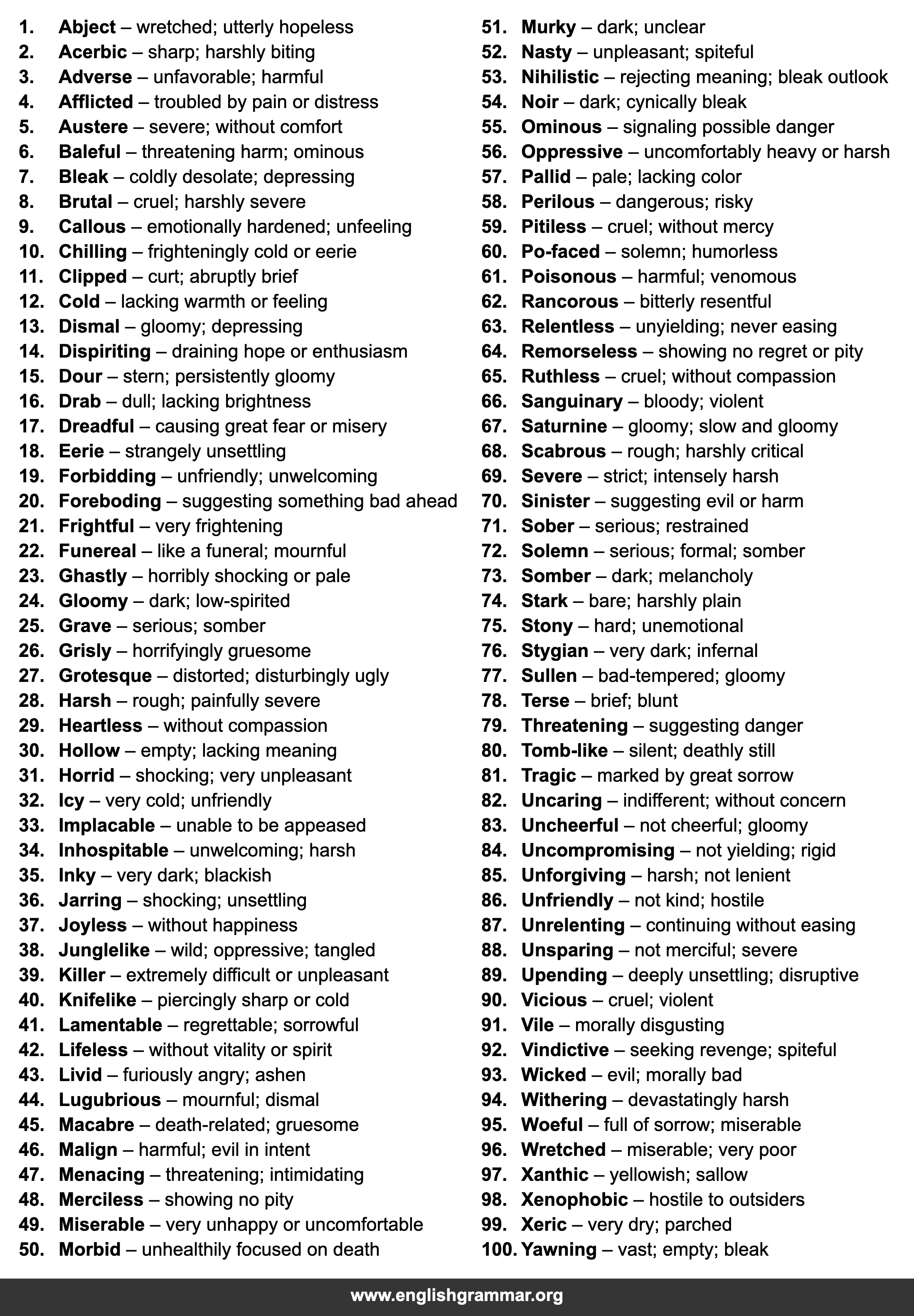 | 13. | Dismal | gloomy; depressing |