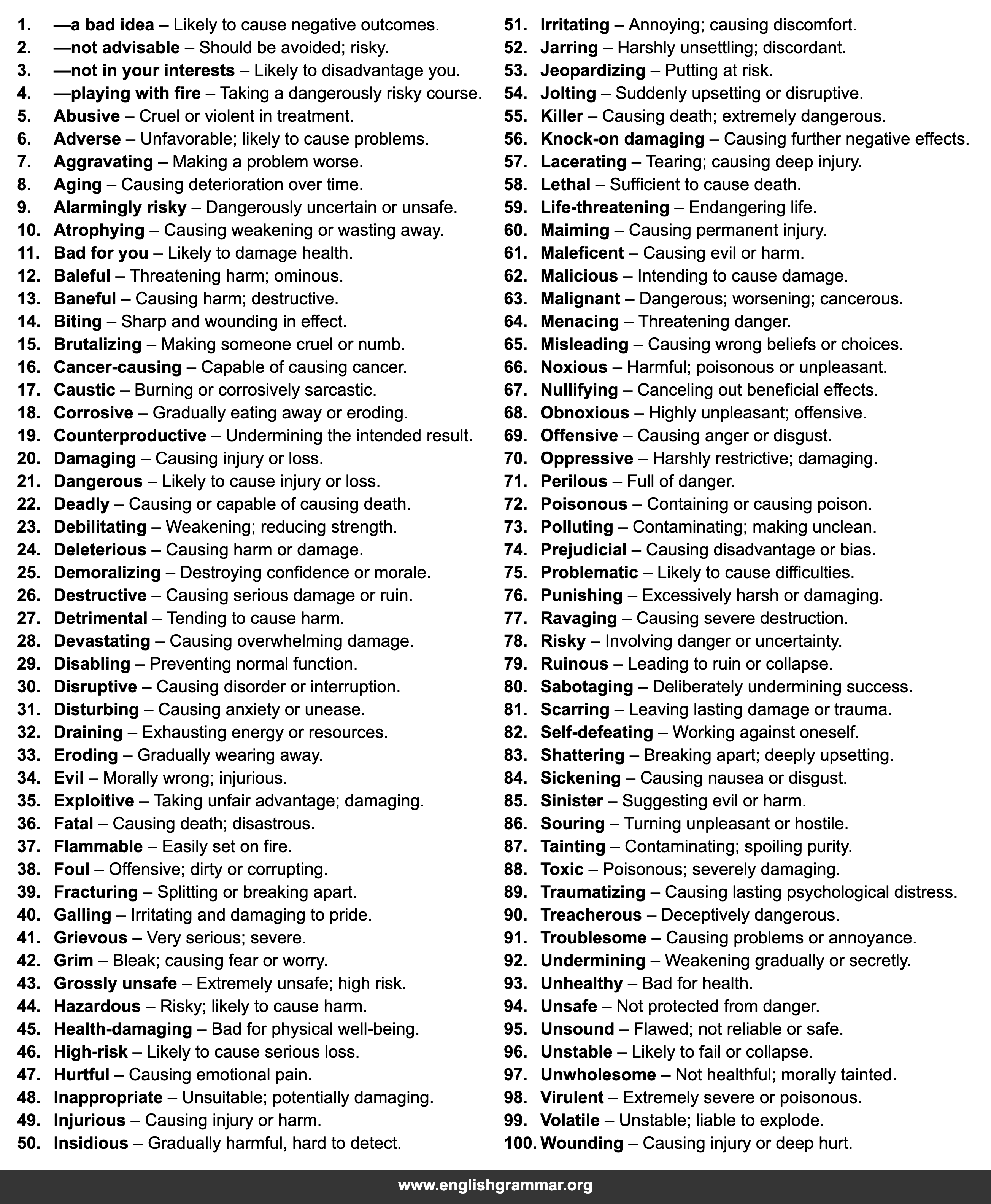 | 44. | Hazardous | Risky; likely to cause harm. |