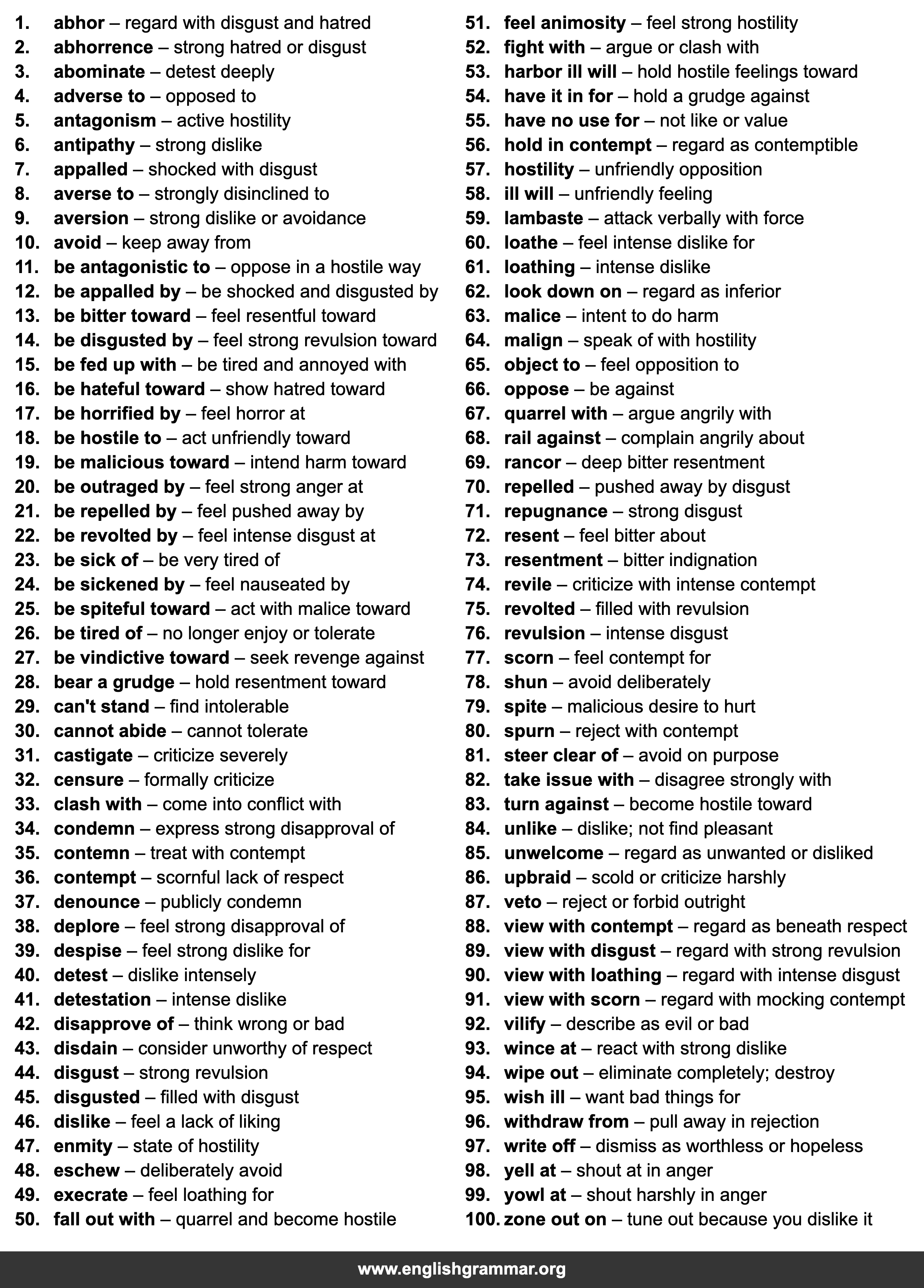 | 61. | loathing | intense dislike |