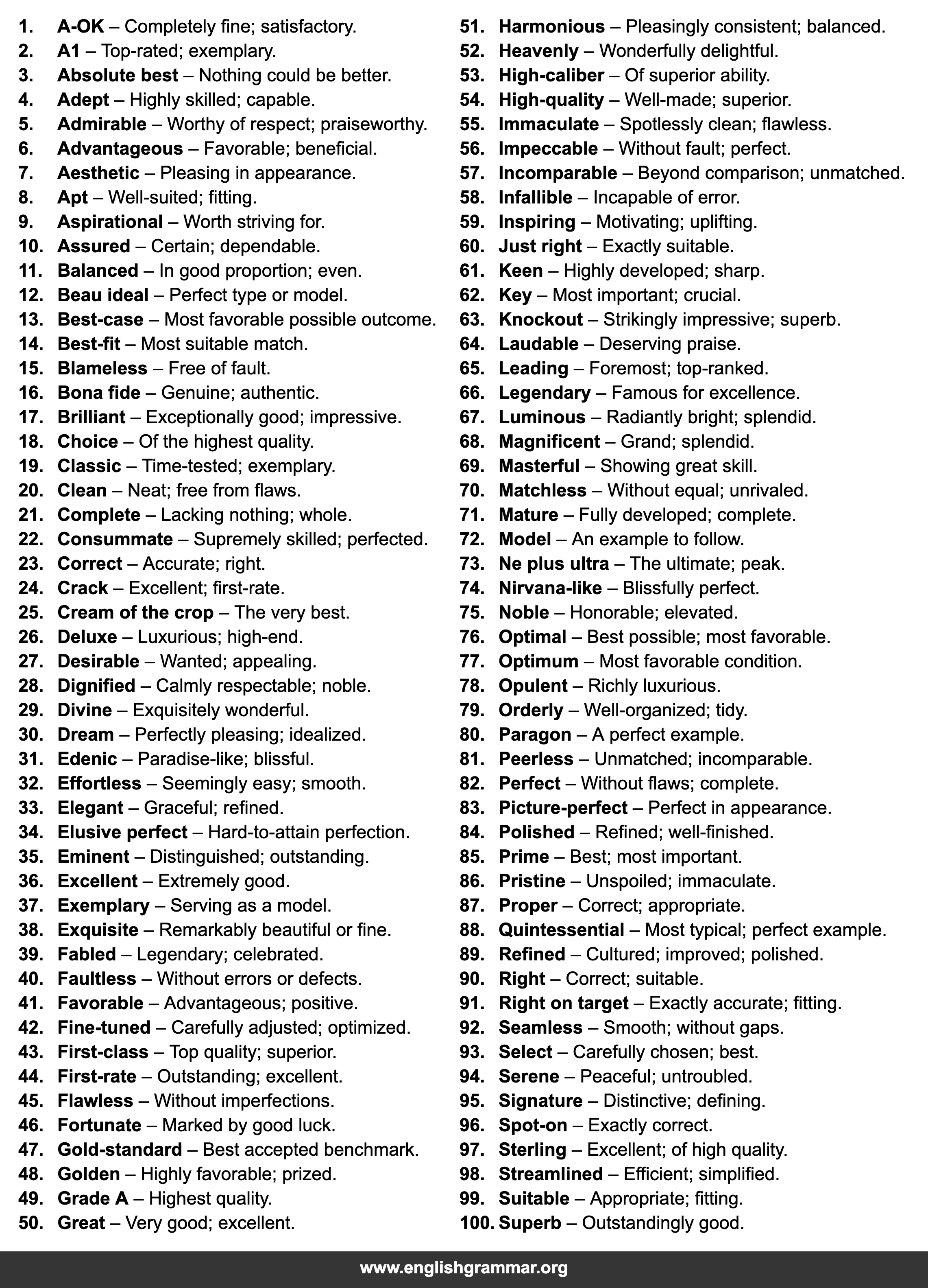 | 100. | Superb | Outstandingly good. |