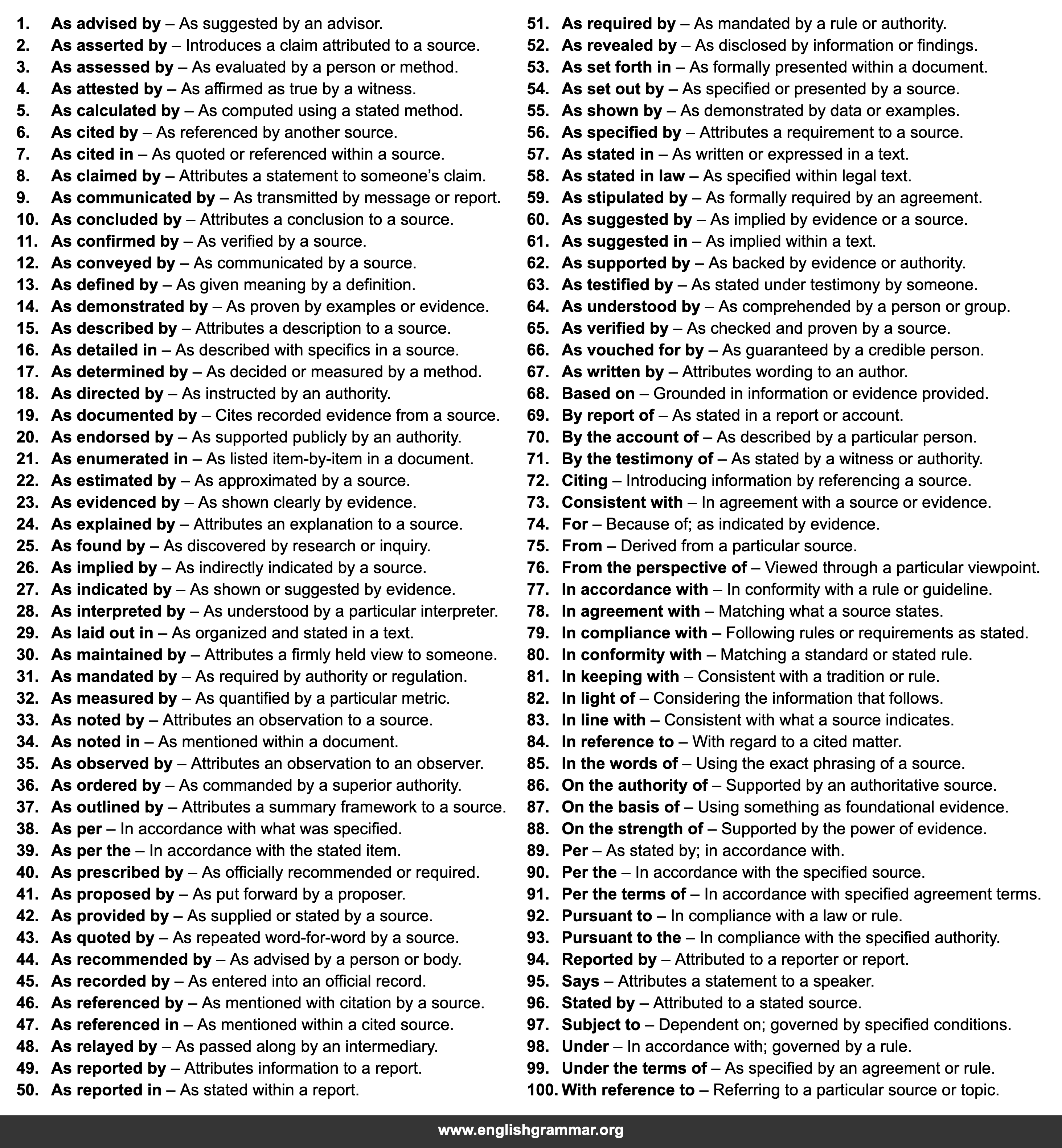 | 46. | As referenced by | As mentioned with citation by a source. |