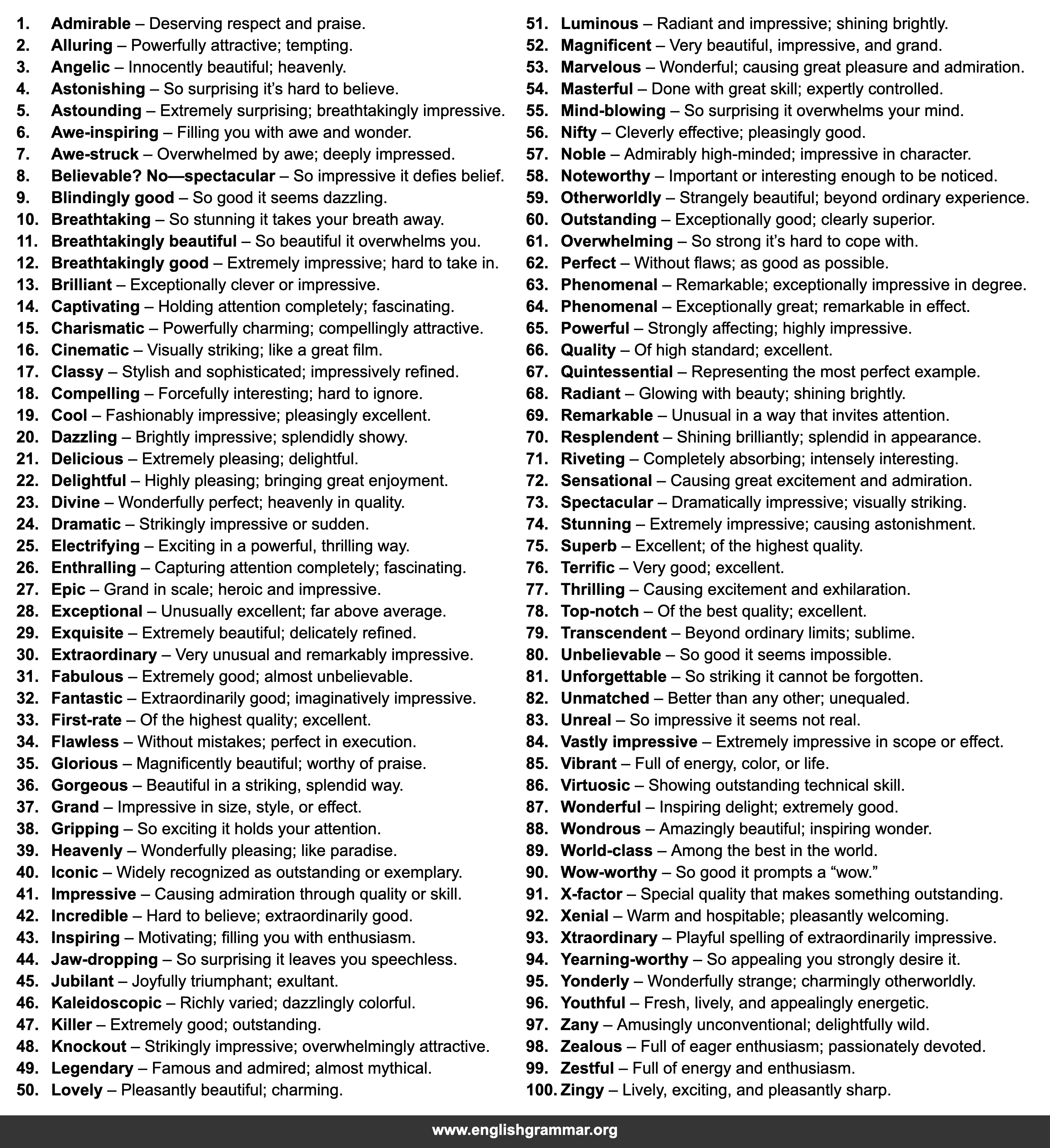 | 25. | Electrifying | Exciting in a powerful, thrilling way. |