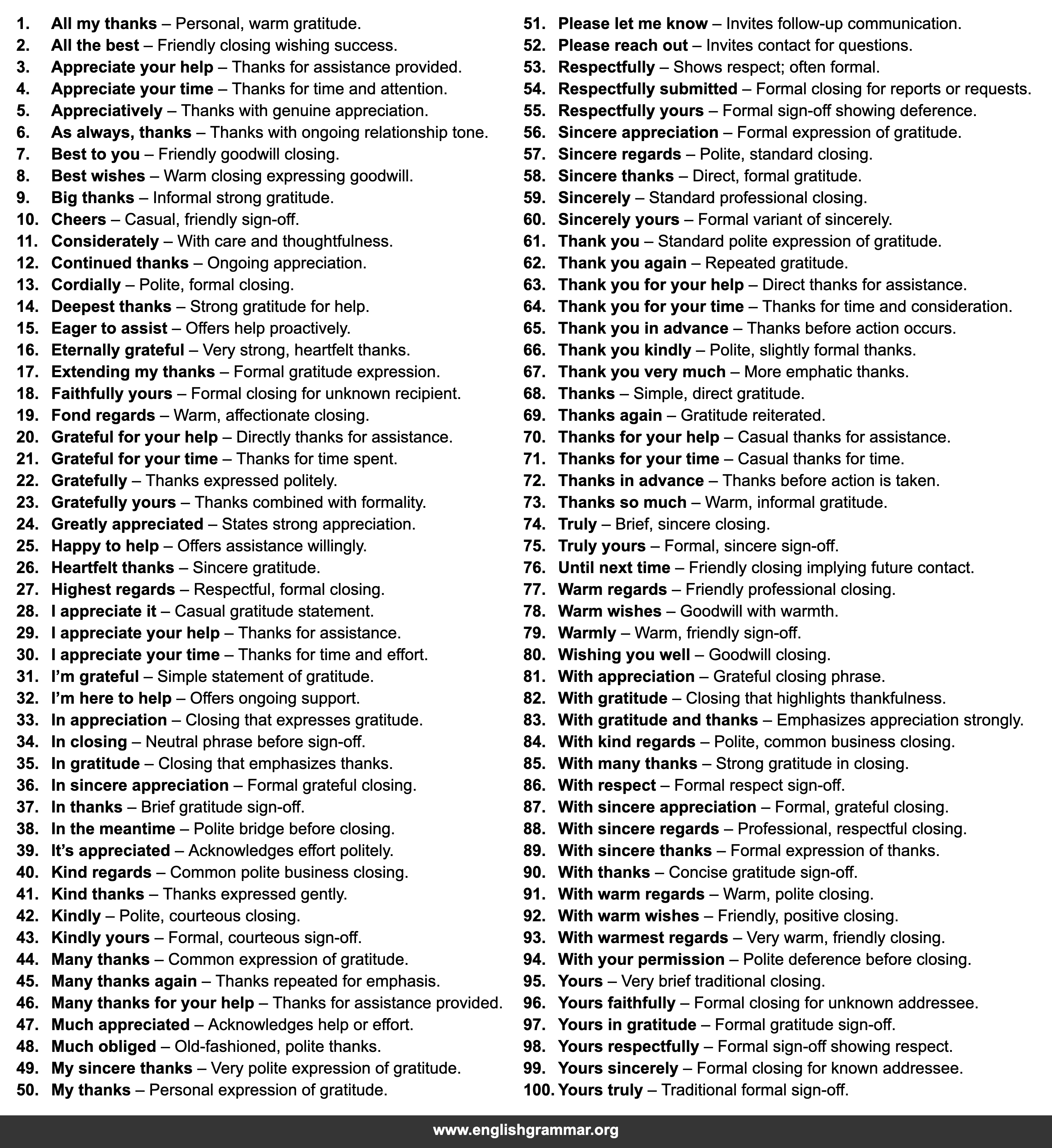 | 90. | With thanks | Concise gratitude sign-off. |